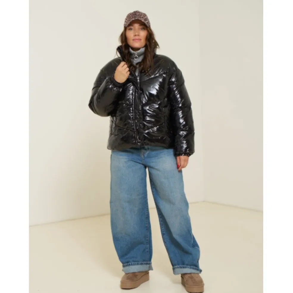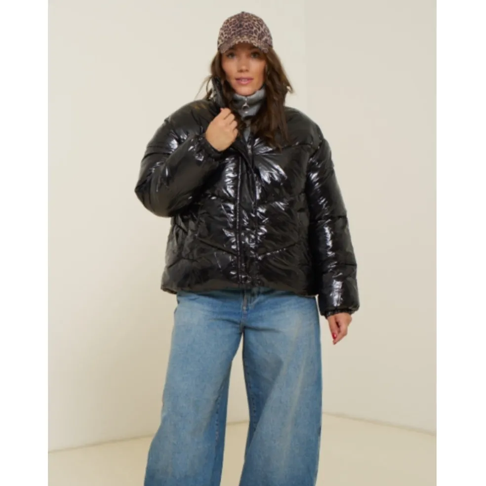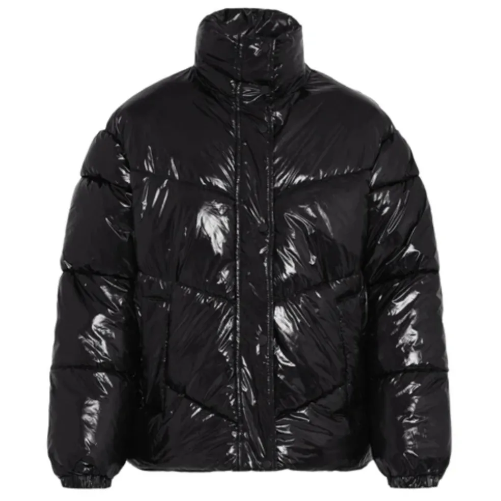 Jakken har høj hals, elastik ved ærme og kan spændes ind i livet.