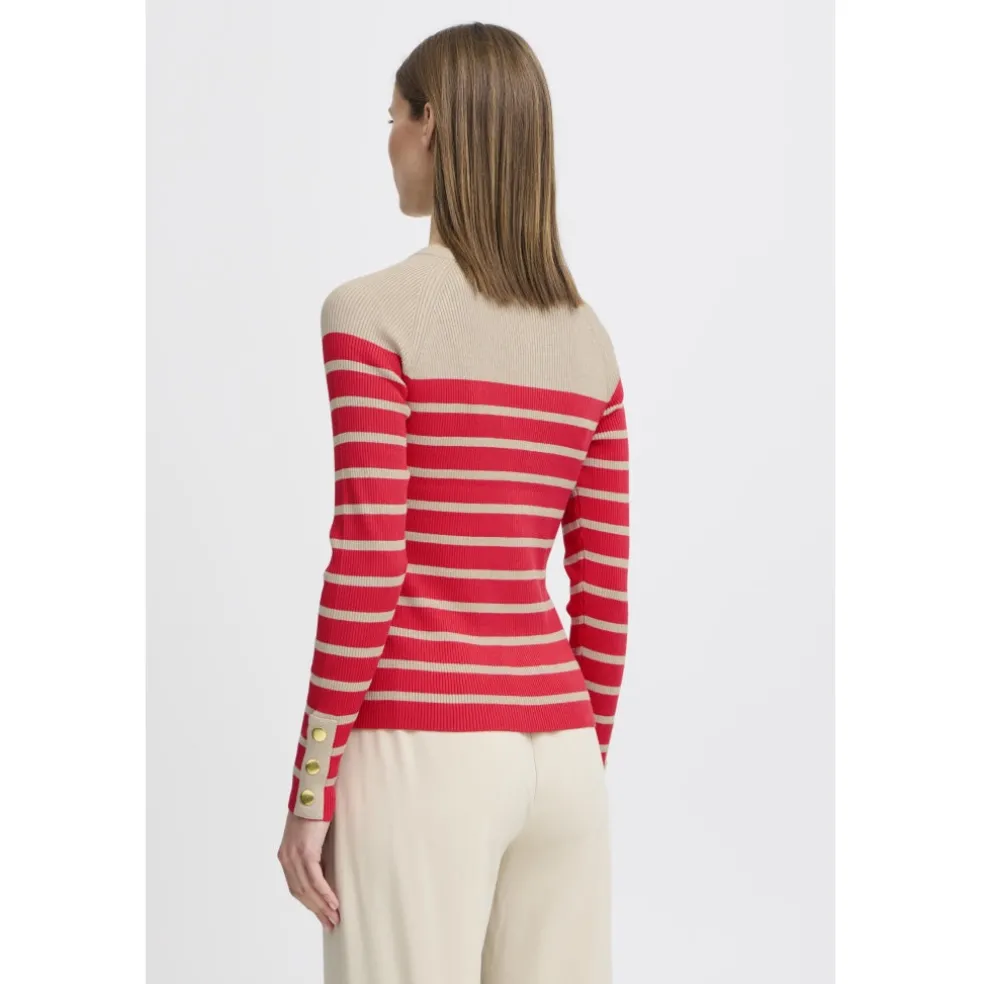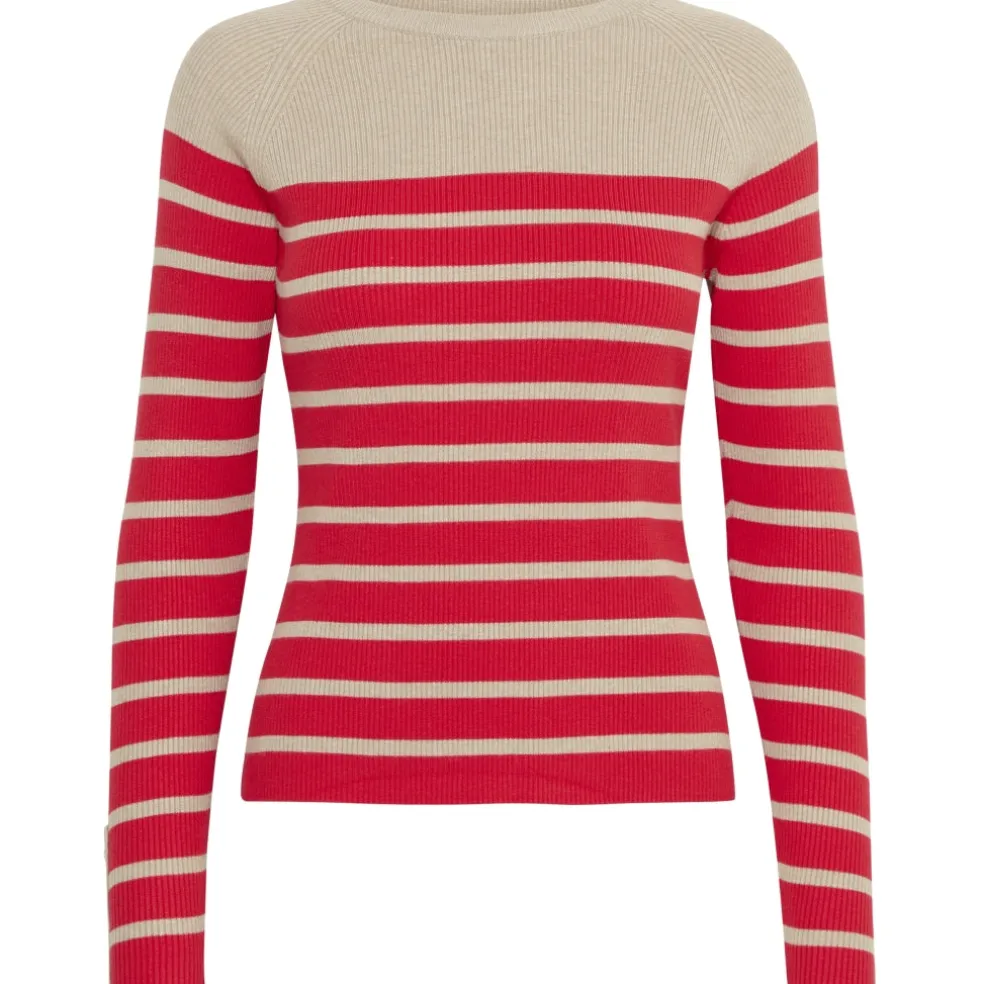 Sød stribet strik med fine knapdetaljer på ærmerne. Komfortabel og stilfuld, perfekt til et casual look.