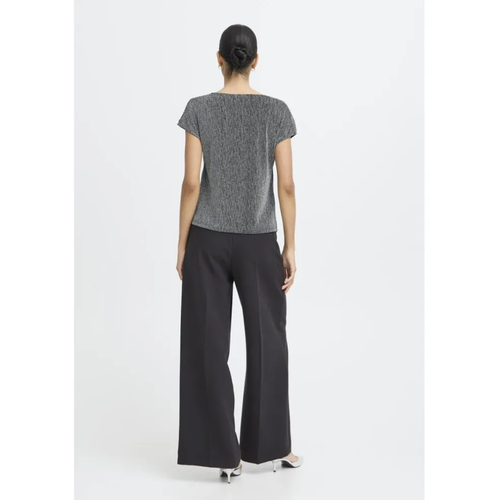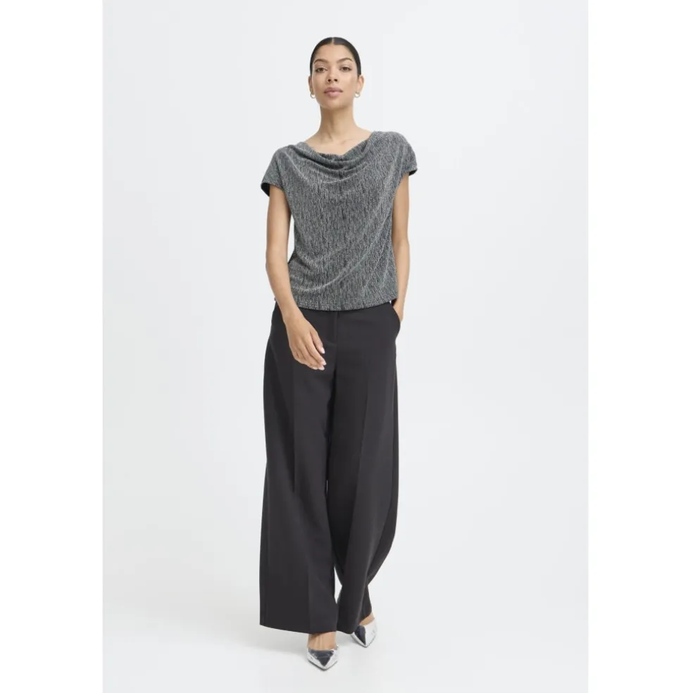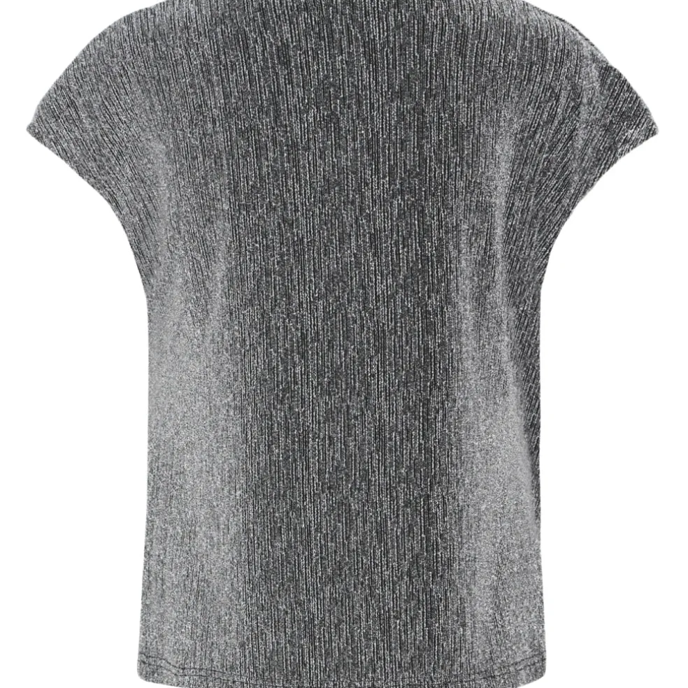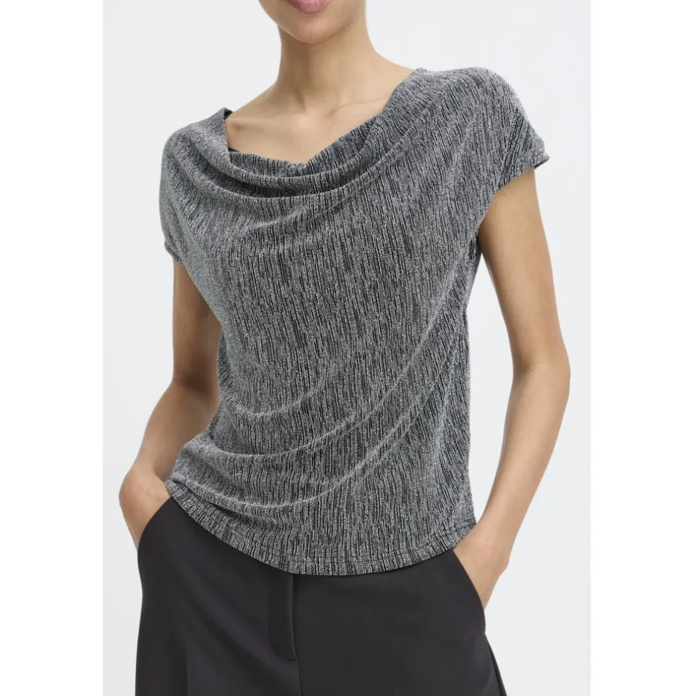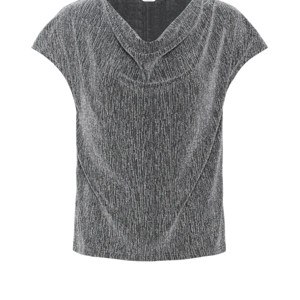 Super flot sølv glimmer top fra B.Young med vandfald åbning ved halsen. Toppen kan styles med et par bukser og en stilet for et festlig look.