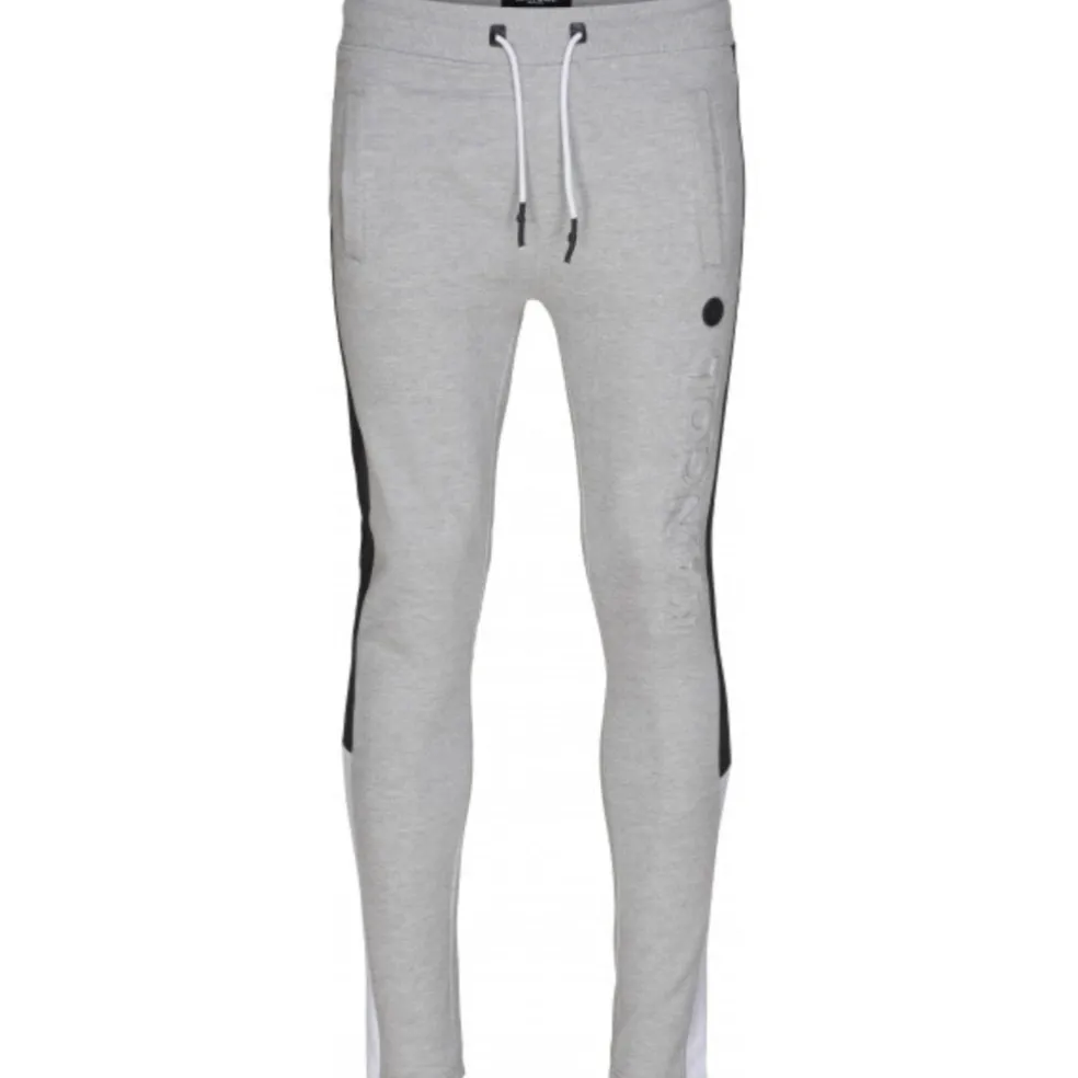 Ned langs benene er der fede farvede detaljer og ned langs venstre ben står der ‘Kangol’.