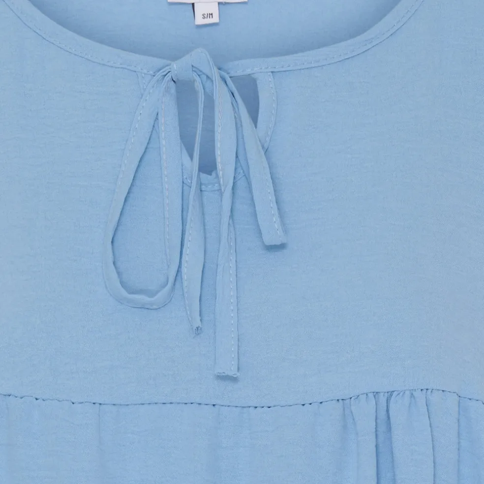 Elegant kjole med et fint bindebånds detalje ved kraven. Kjolen er oplagt at bruge til både hverdag og fest.