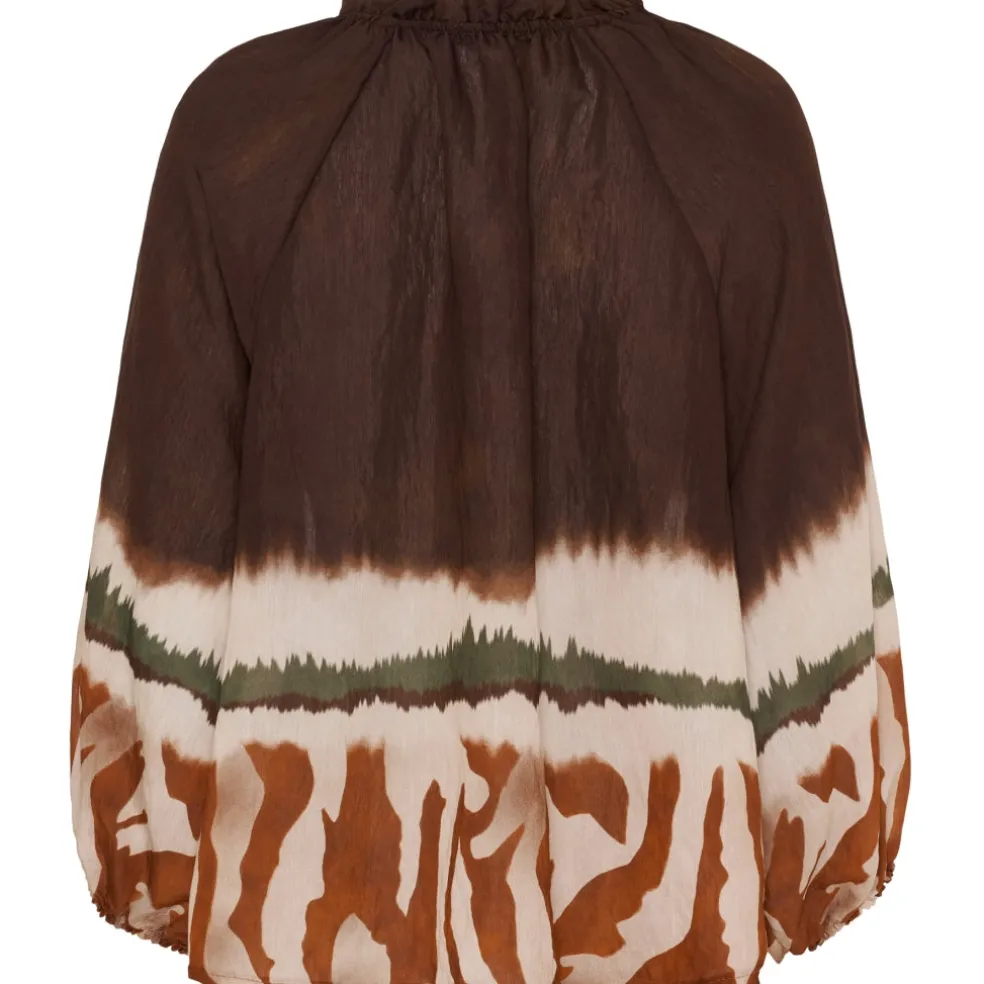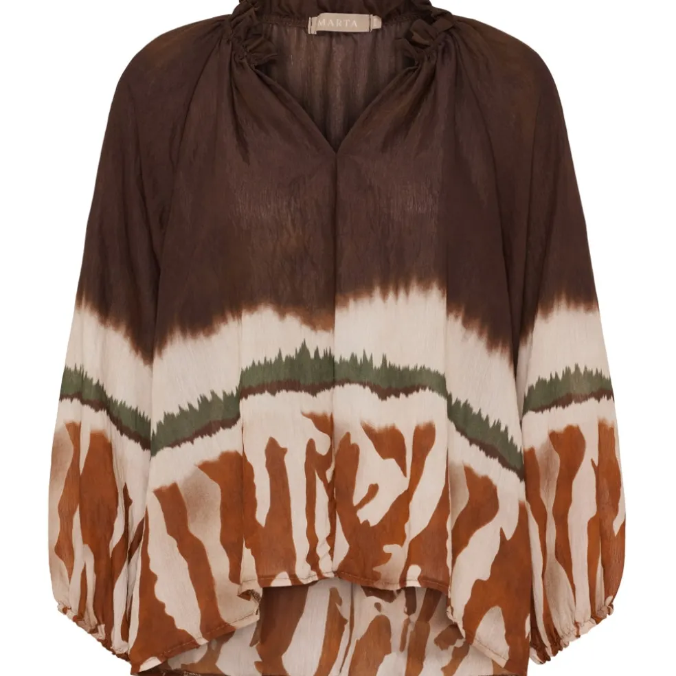 Sød bluse fra Marta du Château i et flot print. Blusen er V-halset med flæse detalje og lidt længere bagtil end foran. Den kan styles med både jeans og sneakers for et hverdags outfit, eller en nederdel og ballerina til finere brug.