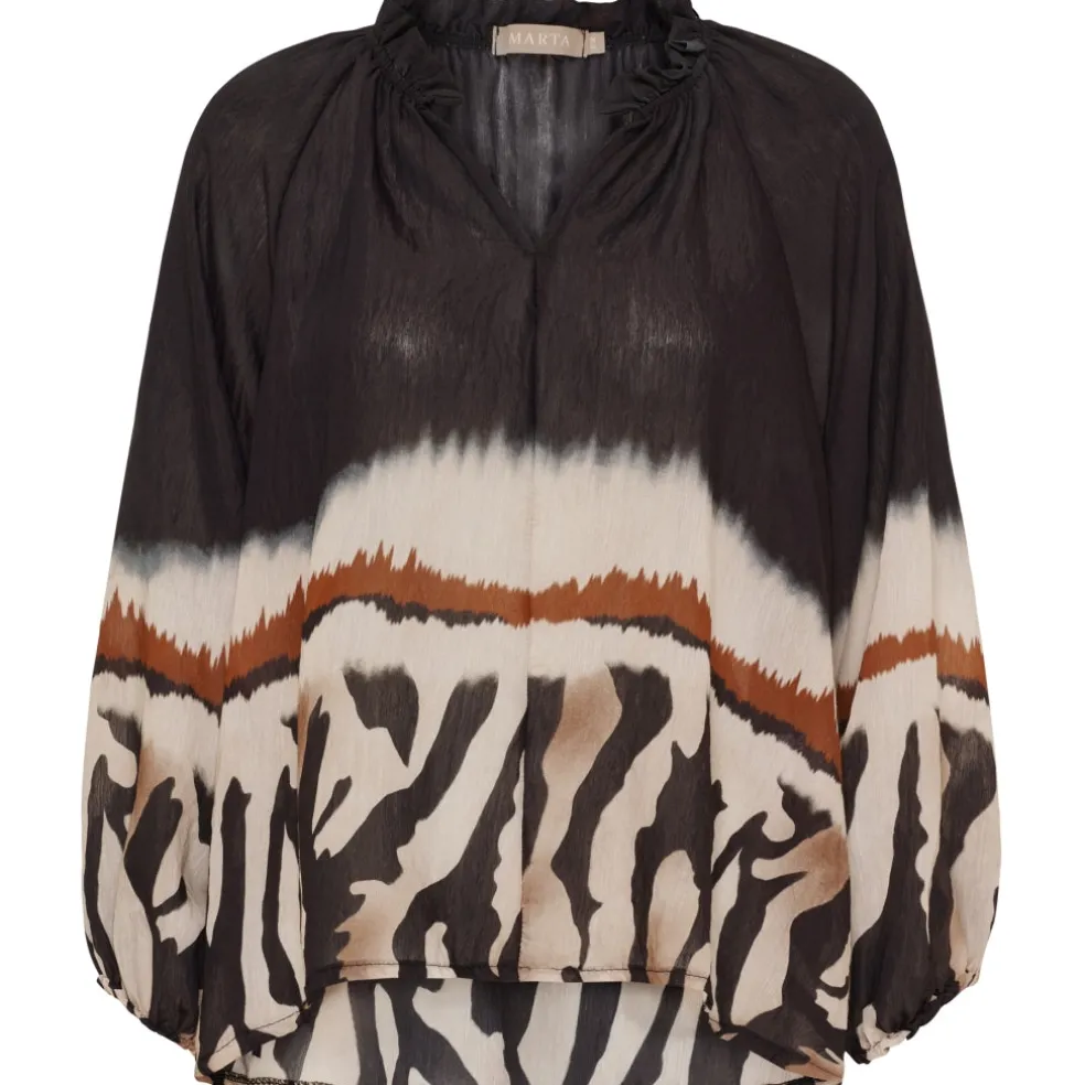 Sød bluse fra Marta du Château i et flot print. Blusen er V-halset med flæse detalje og lidt længere bagtil end foran. Den kan styles med både jeans og sneakers for et hverdags outfit, eller en nederdel og ballerina til finere brug.