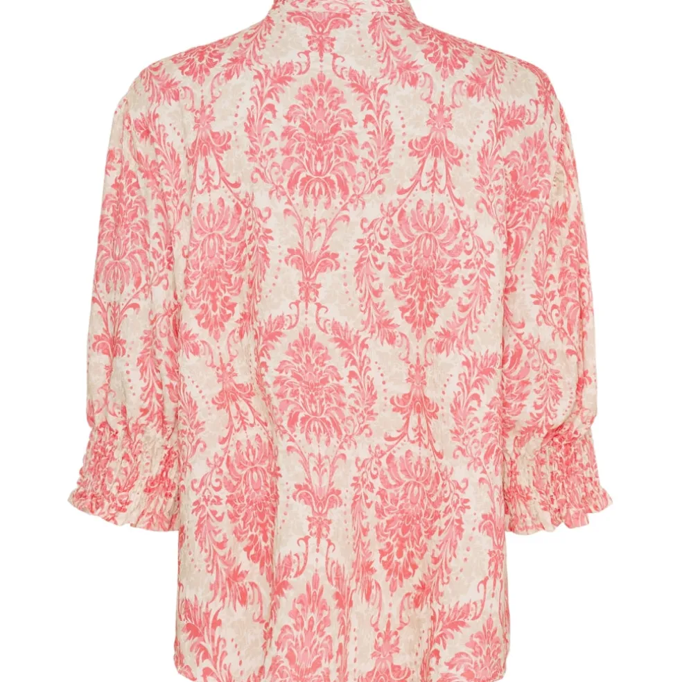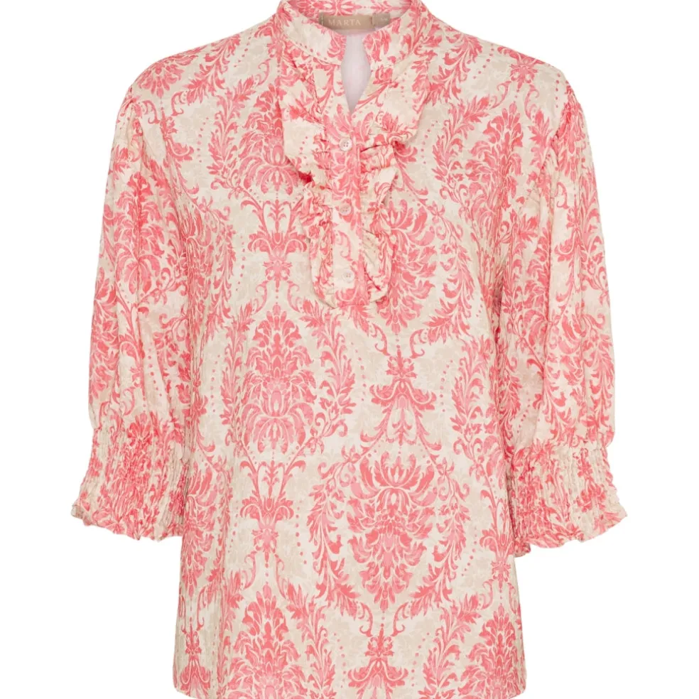 Femin og elegant bluse fra Marta Du Château. Blusen har v-hals, smock ved ærmerne og en enkel flæsedetalje langs halsen. Style den med matchende bukser fra samme serie for et fint sammenhængende look.