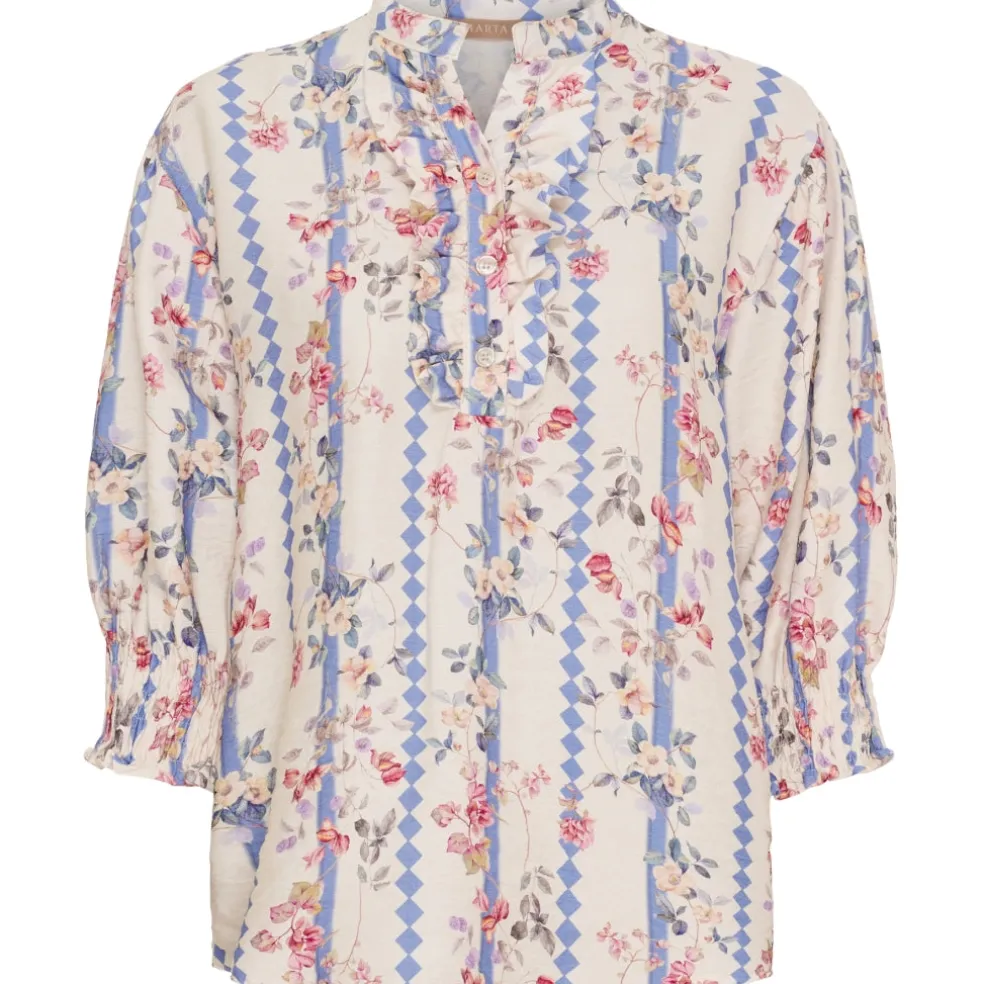 Femin og elegant bluse fra Marta Du Château. Blusen har v-hals, smock ved ærmerne og en enkel flæsedetalje langs halsen. Style den med matchende bukser fra samme serie for et fint sammenhængende look.