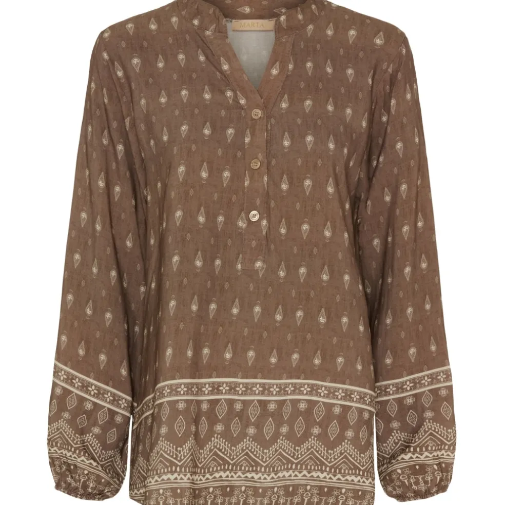 Smuk bluse med feminint mønster fra Marta. Blusen er v-halset og har sofistikerede knapper, og kan både bruges til hverdag og finere anledninger.
