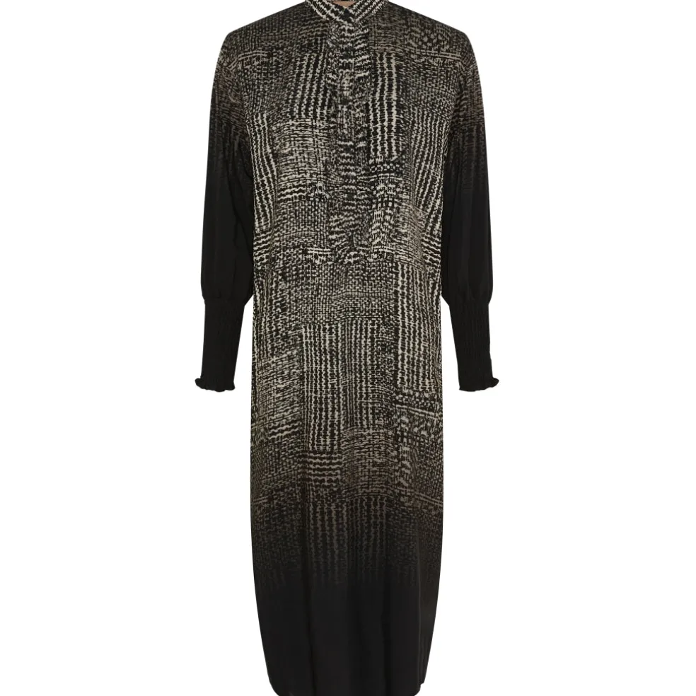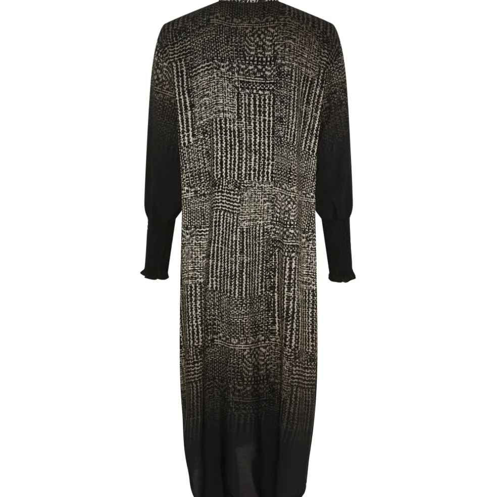 Midikjole med flæser og knapper, samt smock ved ærmerne.