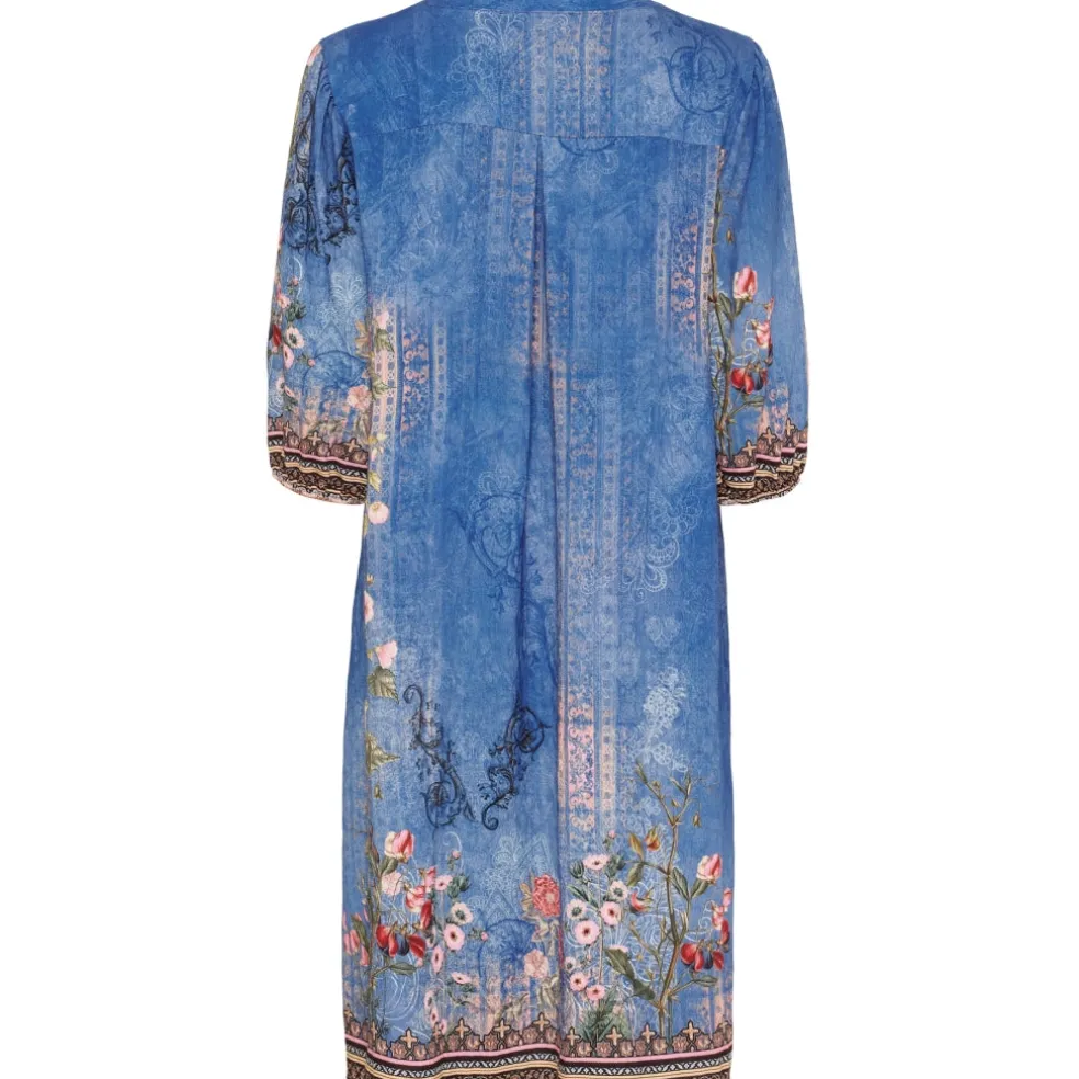 Elegant v-hals kjole fra Marta Du Château i det fineste print. Modellen har 3/4 ærmer og går til ca. midt på skinnebenet. Den kan bruges til hverdag med et par sneakers, og til festlige anledninger med en slingback eller stilet.