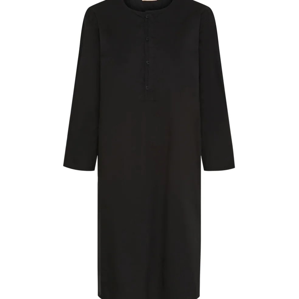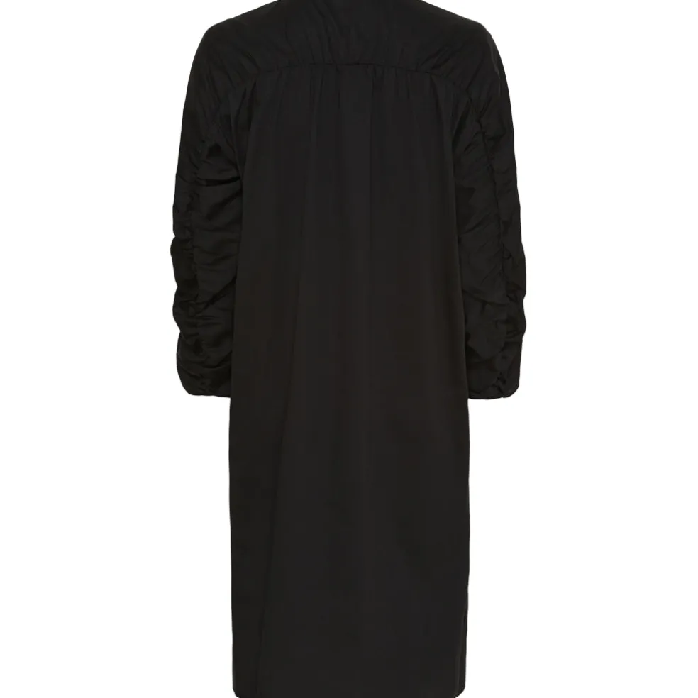 Sej kjole med knapper fremtil og rynket elastikdetalje bagpå ærmerne og ryggen.