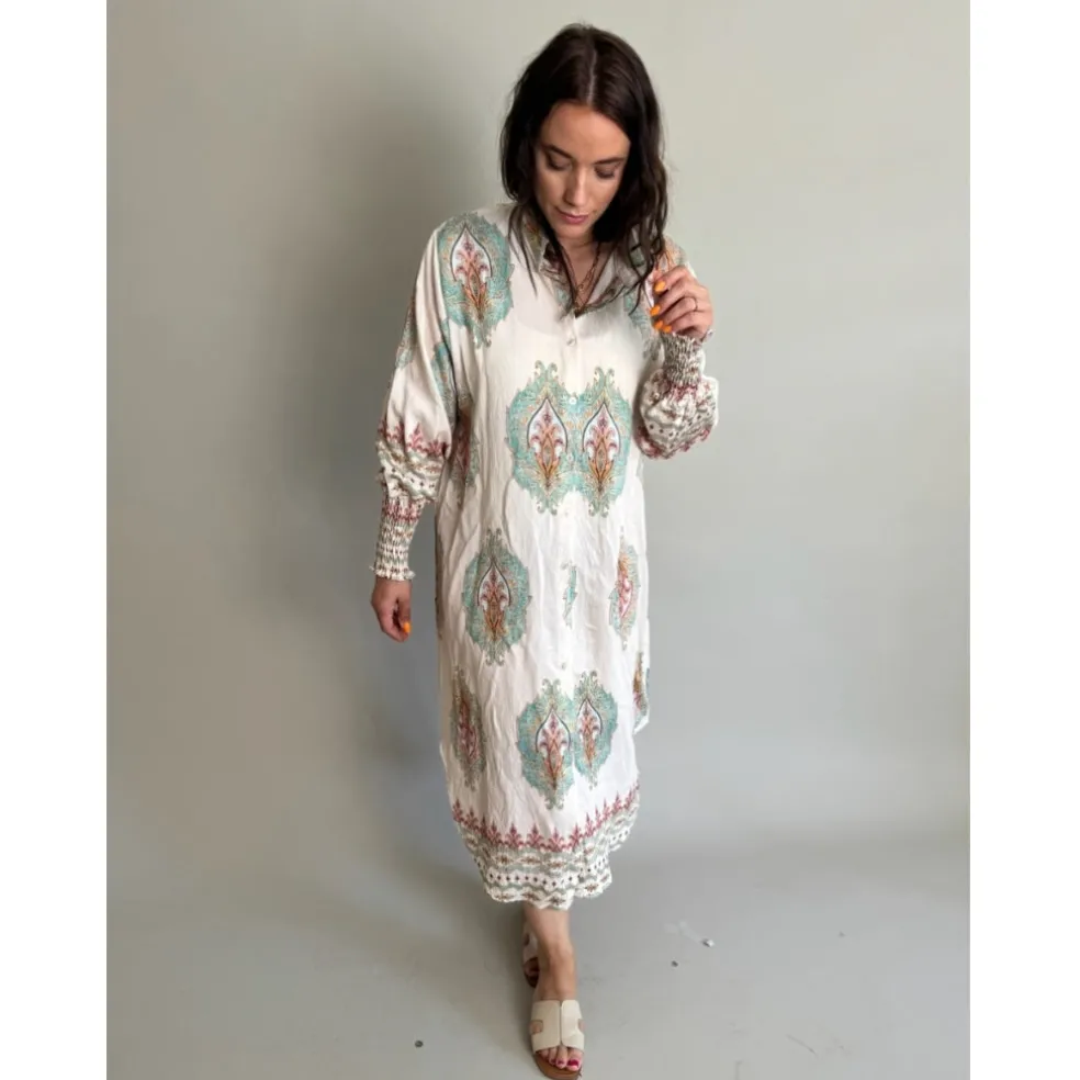 Smuk printet gennemknappet kjole fra Marta Du Château. Kjolen har smock ved ærmerne og er super feminin og elegant.