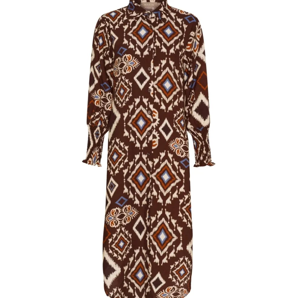 Smuk og elegant printet kjole fra Marta Du Château. Kjolen er gennemknappet, har krave og smock ved ærmer. Kan bruges til både hverdag og finere brug.