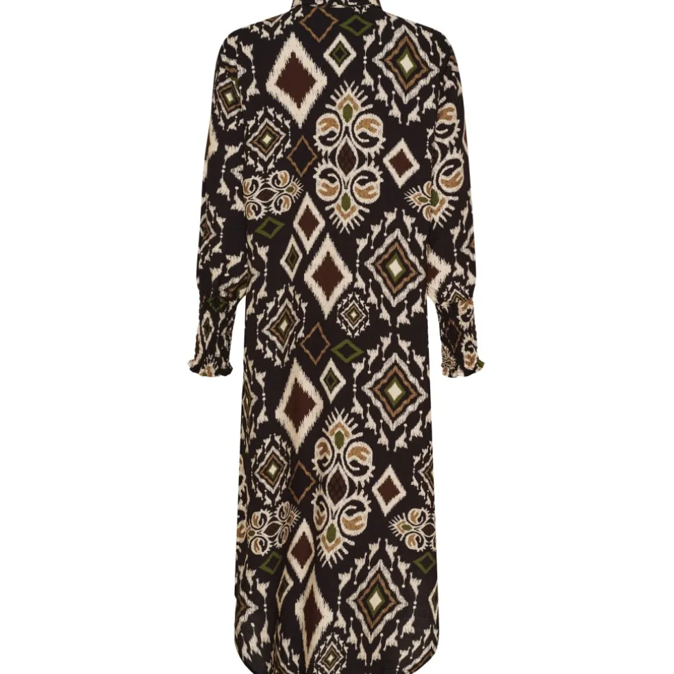 Smuk og elegant printet kjole fra Marta Du Château. Kjolen er gennemknappet, har krave og smock ved ærmer. Kan bruges til både hverdag og finere brug.