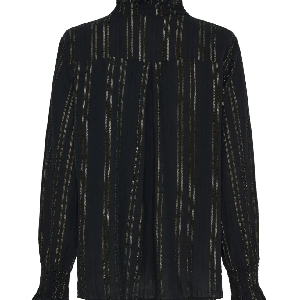 Smuk bluse med flæser, glimmer og elegante knapper. Blusen har en høj, feminin krave som tilfører et ekstra touch til dit outfit.