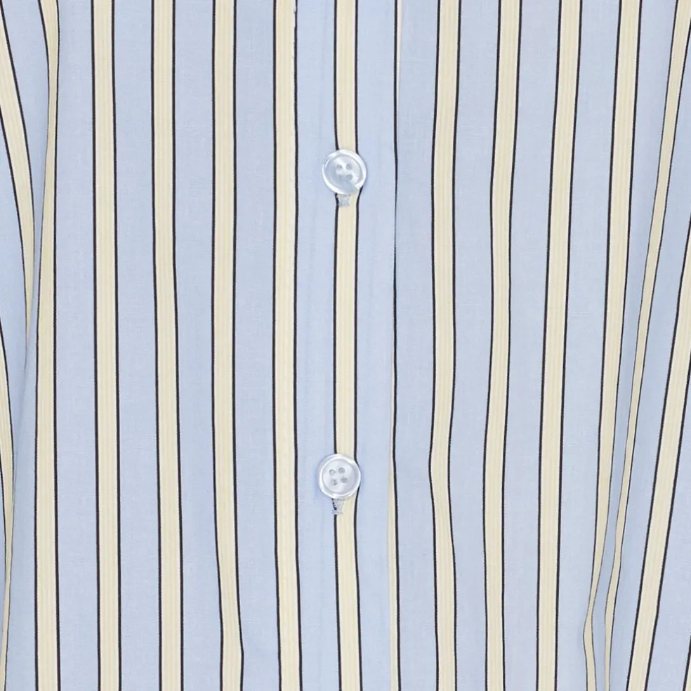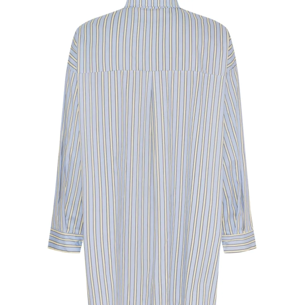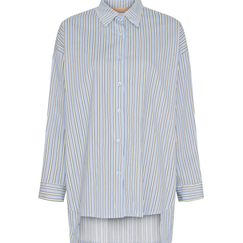 Super cool stribet skjorte der er lidt længere bagtil end foran. Skjorten er gennemknappet og har en klassisk krave. Super nem at style med både jeans og nederdele alt efter looket du går efter.