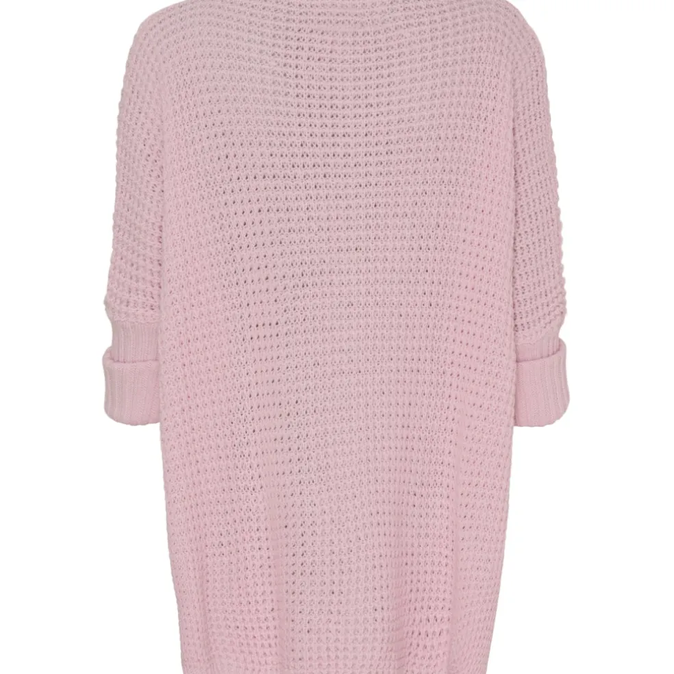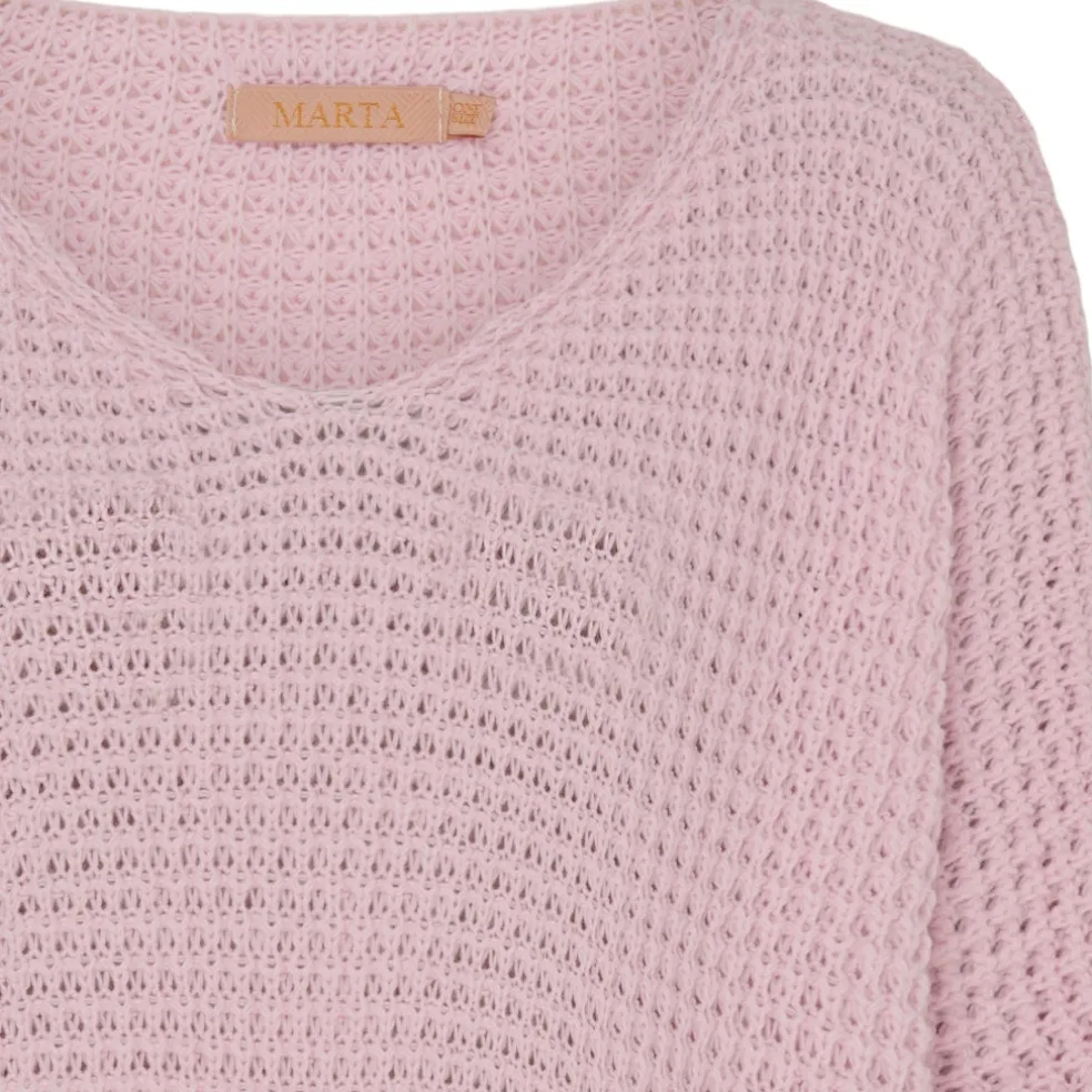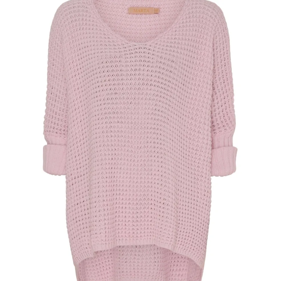 Lækker striktrøje med opsmøgede ærmer fra Marta du chateau. Længere bagtil end foran og med rund hals.