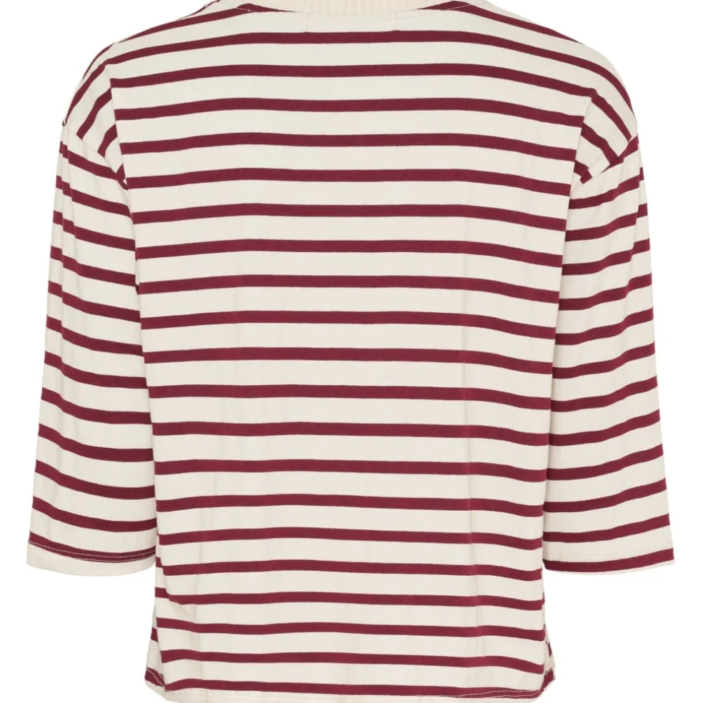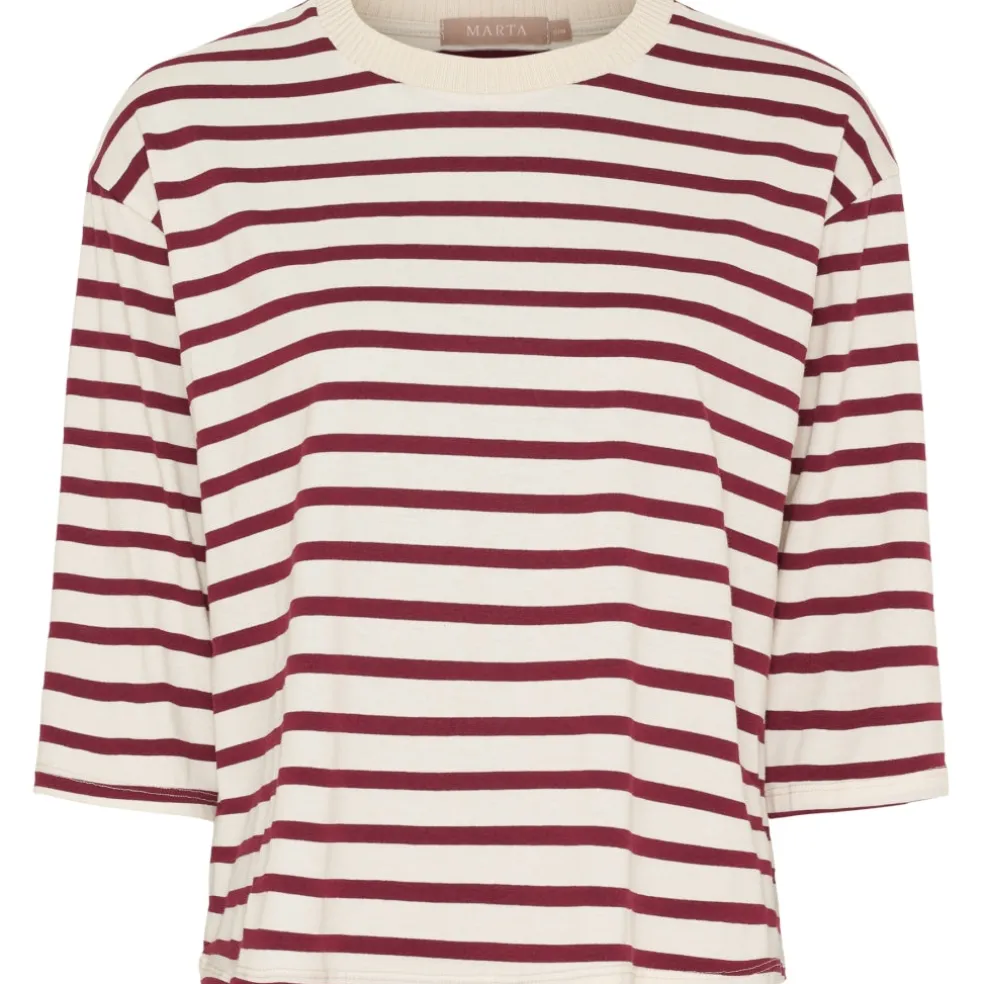 Basic og komfortabel stribet t-shirt fra Marta Du Château. Den har rund hals med ribkant og 3/4 lange ærmer. Ideel til hverdag med et par enten jeans, bukser eller nederdel.