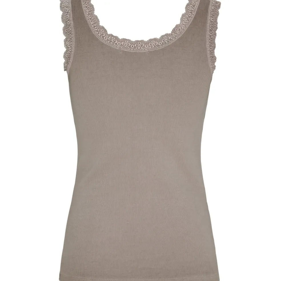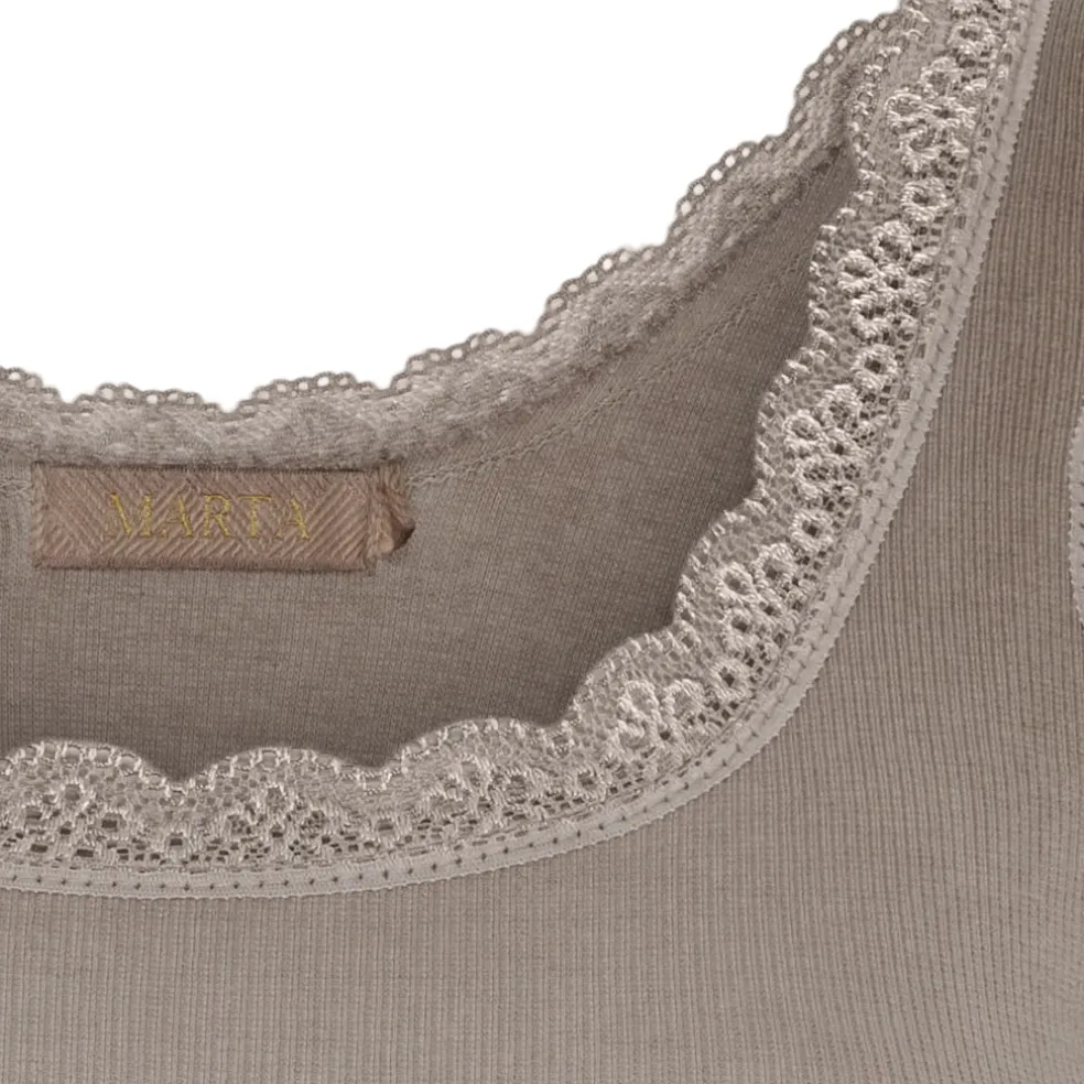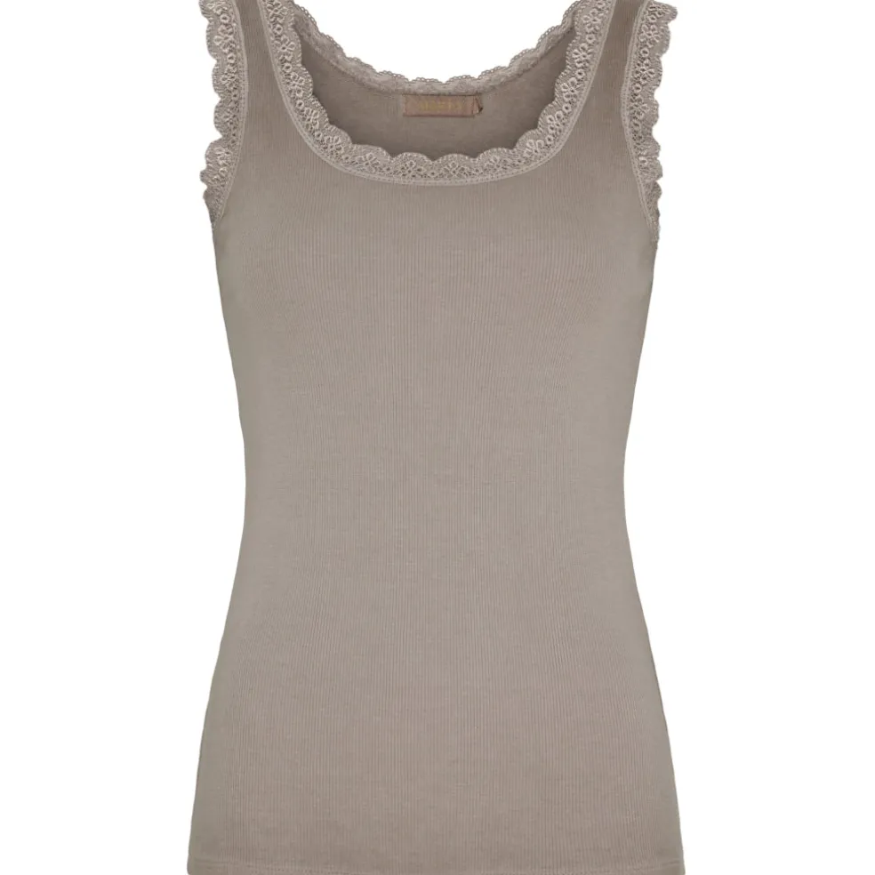 Feminin tanktop med fine blondedetaljer langs halsudskæringen og ærmegaberne. Fungerer som basislag eller til at style alene på varme dage.
