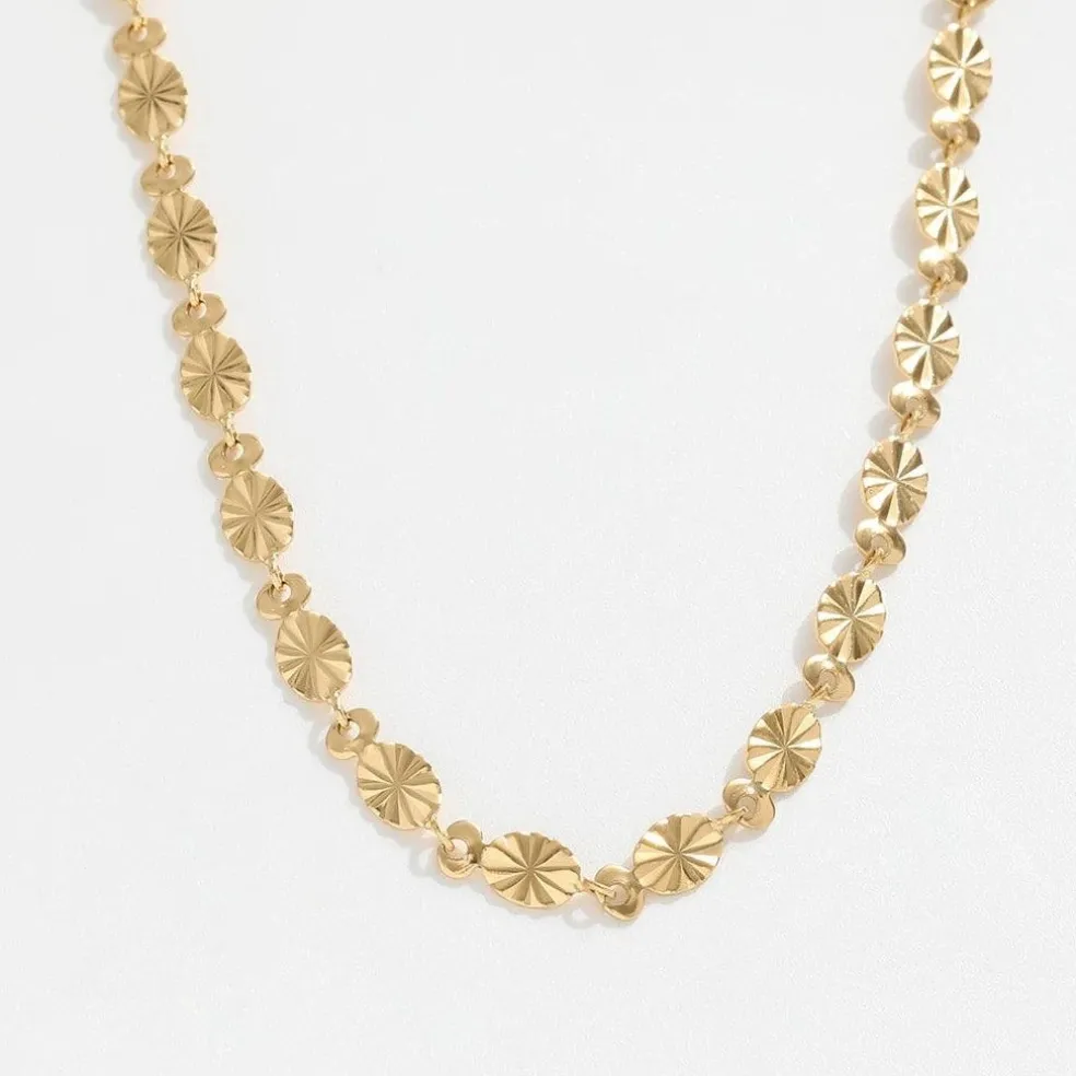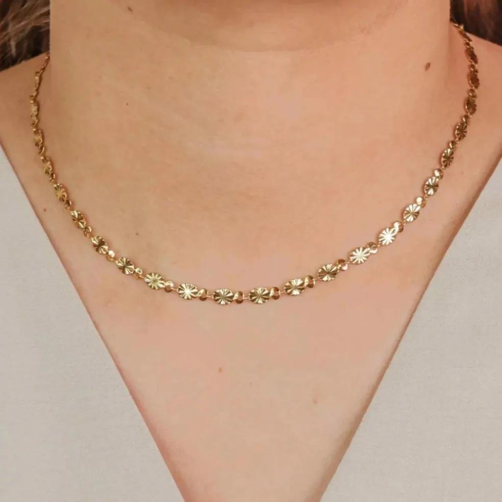 Smuk halskæde i unikt look fra Muun Studio. Halskæden glimter smukt når det bevæger sig og er elegant og iøjnefaldende.