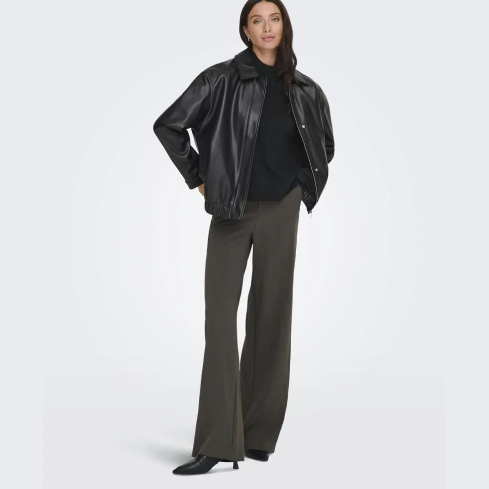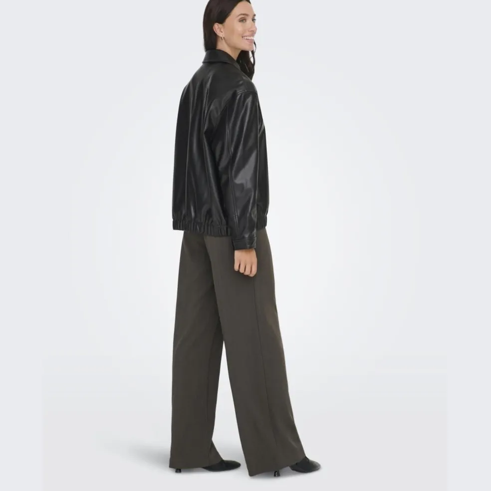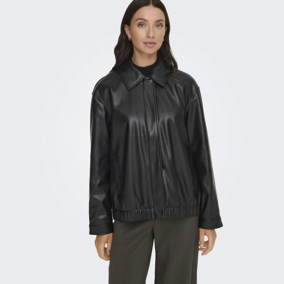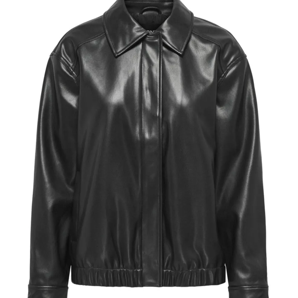 Cool bomber jakke fra ONLY i imiteret læder. Jakken har krave og lynlås, samt elastik nederst. Perfekt til efteråret udover en strik, langærmet bluse eller skjorte.