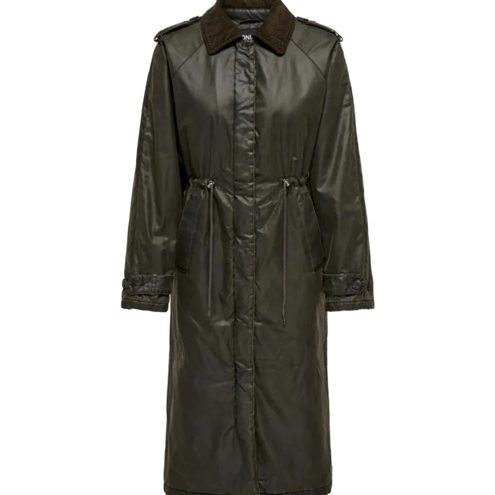 Cool jakke med krave og sidelommer fra Only. Jakken har fine detaljer som snørrer og en skinnende overflade.