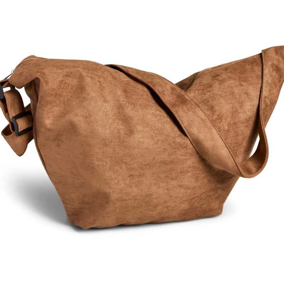 Sejeste suede taske fra Pieces med god rummelighed. Tasken har en justerbar rem, indvendig lomme med lynlås og to åbne lommer indvendig, samt lynlås-lukning.