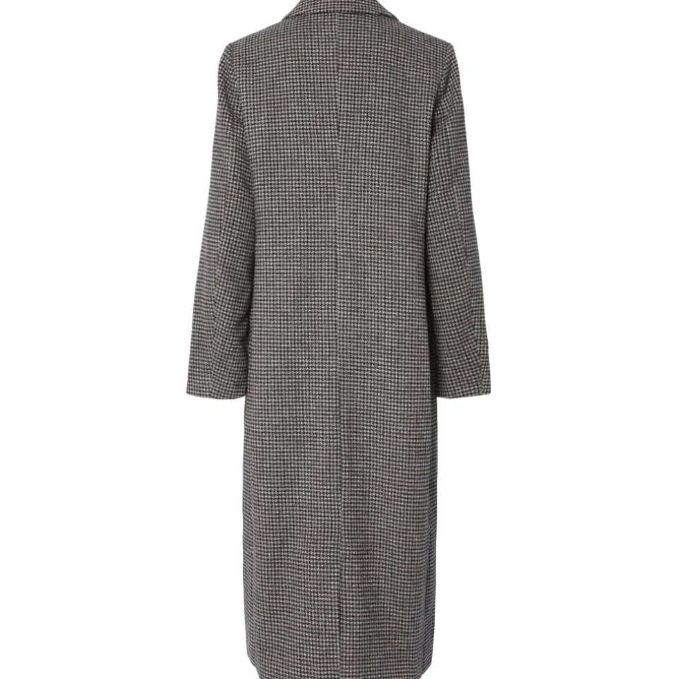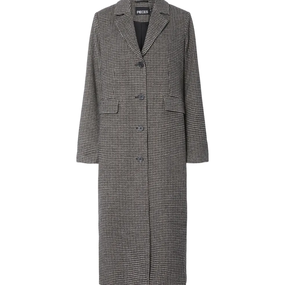 Flotteste lang frakke fra Pieces i ternet mønster. Frakken har V-udskæring og knapper front, samt lommer foran. Den er helt perfekt til de koldere dage.