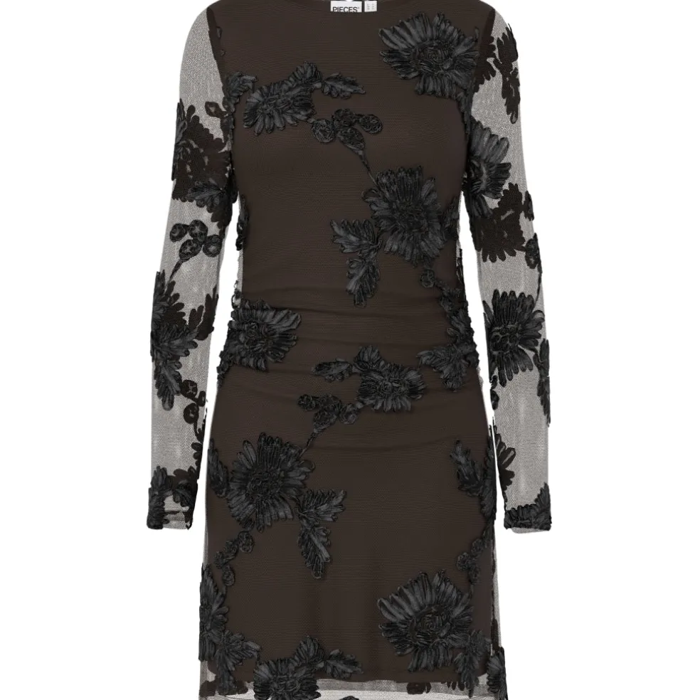 Kort kjole med tætsiddende pasform og rund halsudskæring. Har lange, smalle ærmer og en kort længde. Velegnet til festlige lejligheder.