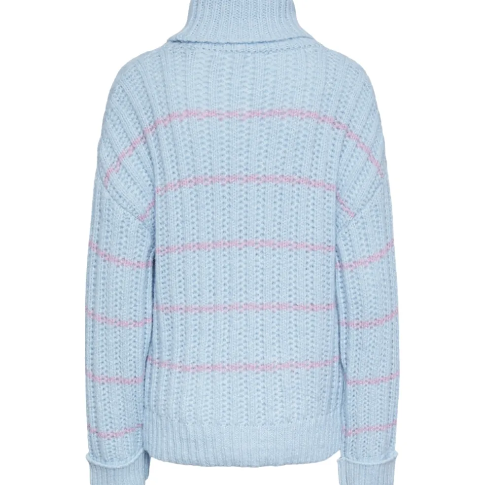 Strik med rullekrave og lange ærmer med vidde. Style med et par jeans og støvler for at få et smart hverdags look.
