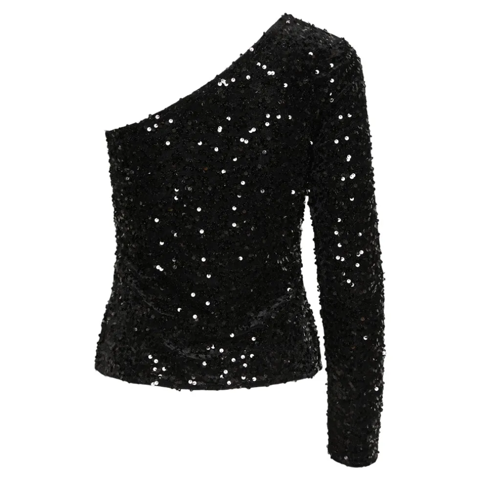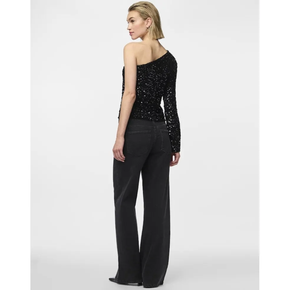 Den smukkeste one shoulder palliet top fra Pieces. Toppen kan styles med nederdelen fra samme serie for et komplet, festligt look.