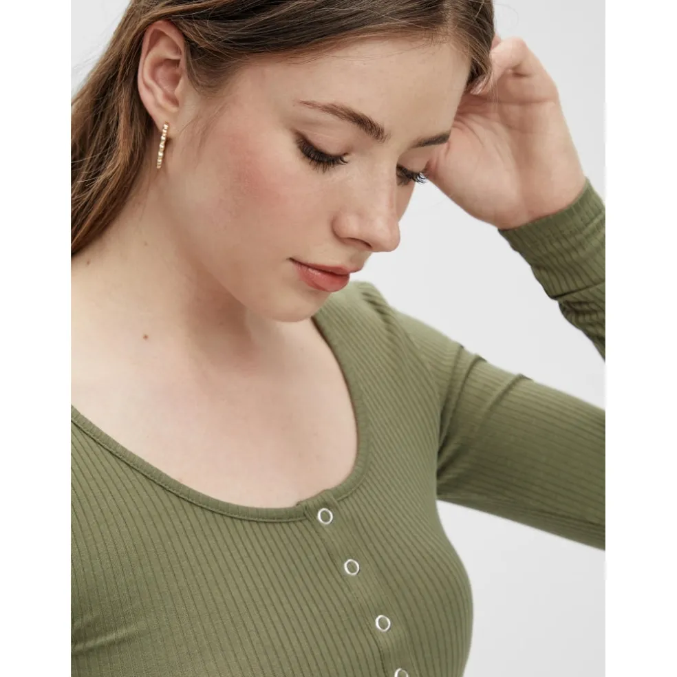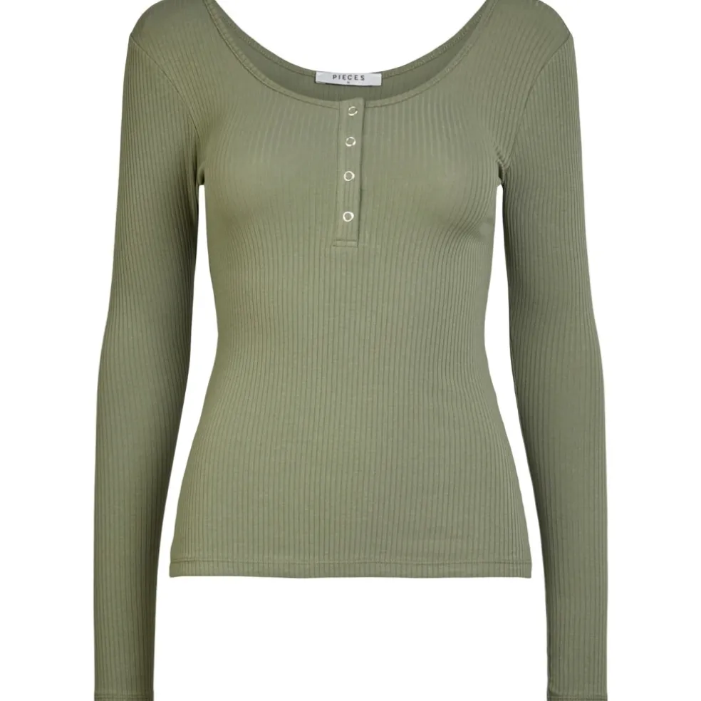 Flot langærmet bluse fra PIECES. Blusen er lavet i rib kvalitet og har trykknapper foran.