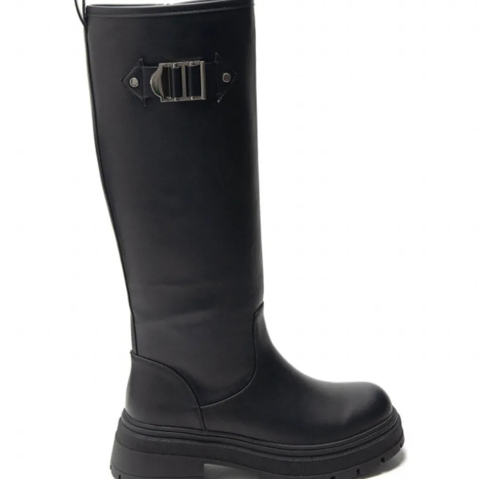 Super sej knæhøj støvler med en chunky sål. Støvlerne har en lynlås på indersiden og spænde detalje på ydersiden.