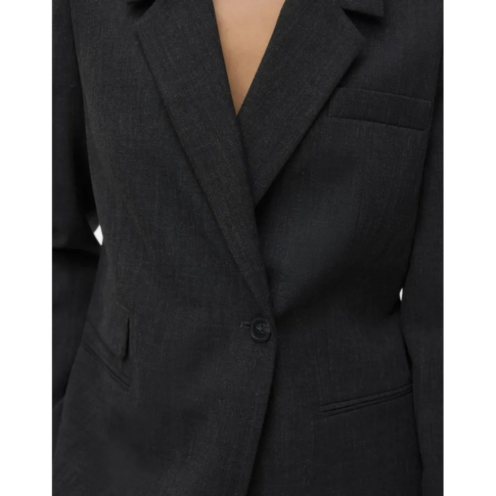 En mørkegrå melange blazer i regular fit med omvendt krave og knaplukning. Blazeren har frontlommer og polyesterfor for komfort.