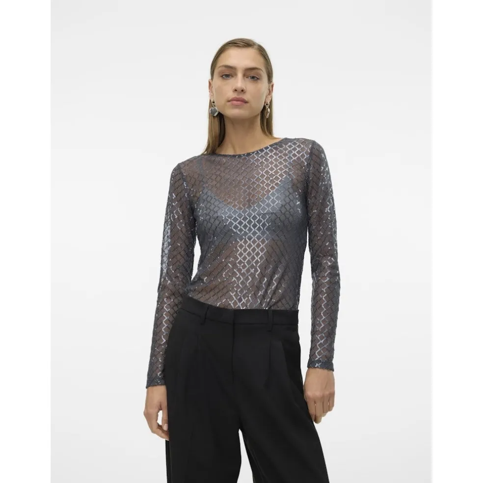 Sej, let gennemsigtig meshbluse fra Vero Moda. Blusen kan styles med matchende bukser fra samme serie for et komplet festligt look.