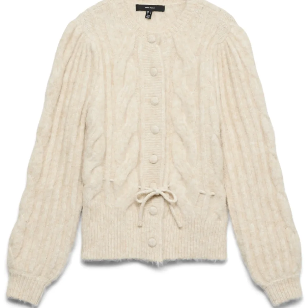 En strikket cardigan med rund hals og ribbede manchetter, der giver et elegant og komfortabelt lag til dit efterårsoutfit. Perfekt til både afslappede og mere formelle looks.