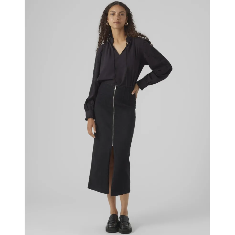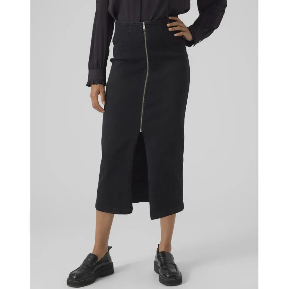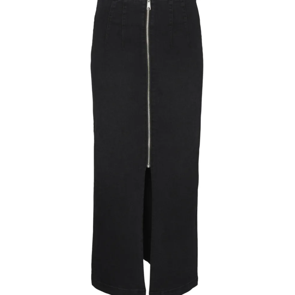 Virkelig cool lang denim nederdel i sort fra Vero Moda. En cool detalje ved nederdelen er lynlåsen og slidsen foran. Nederdelen er højtaljet.