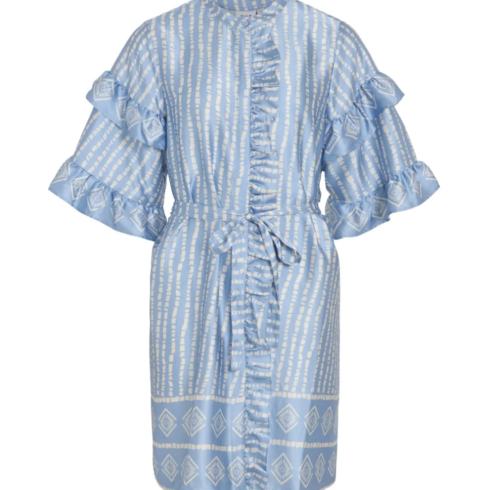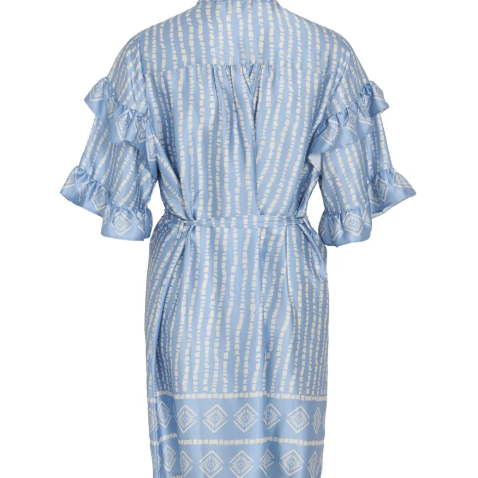 Smuk kjole fra Vila i det fineste mønster. Den har flæser på ærmerne og front, samt bindebånd i taljen. Kjolen kan bruges både til hverdag og finere brug.