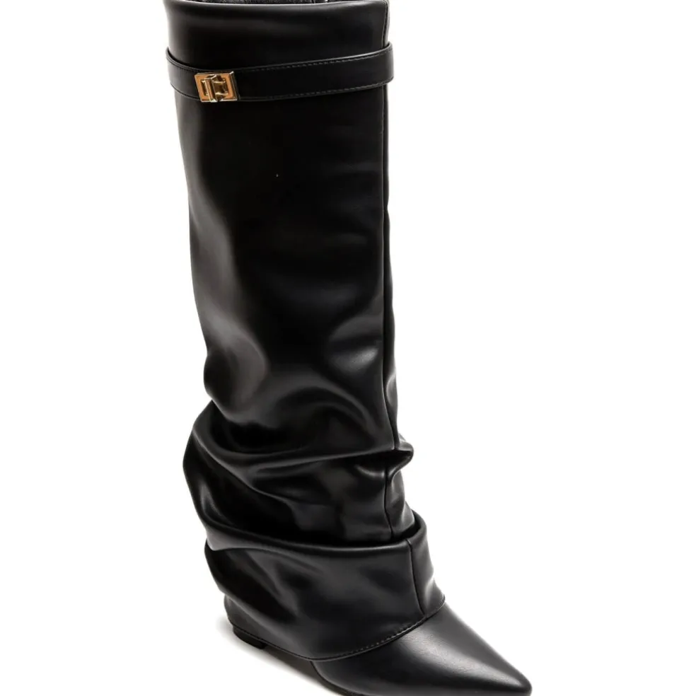 Cool højskaftet støvle med spids snude i imiteret skind, perfekt til både hverdag og fest.