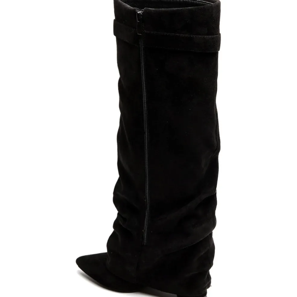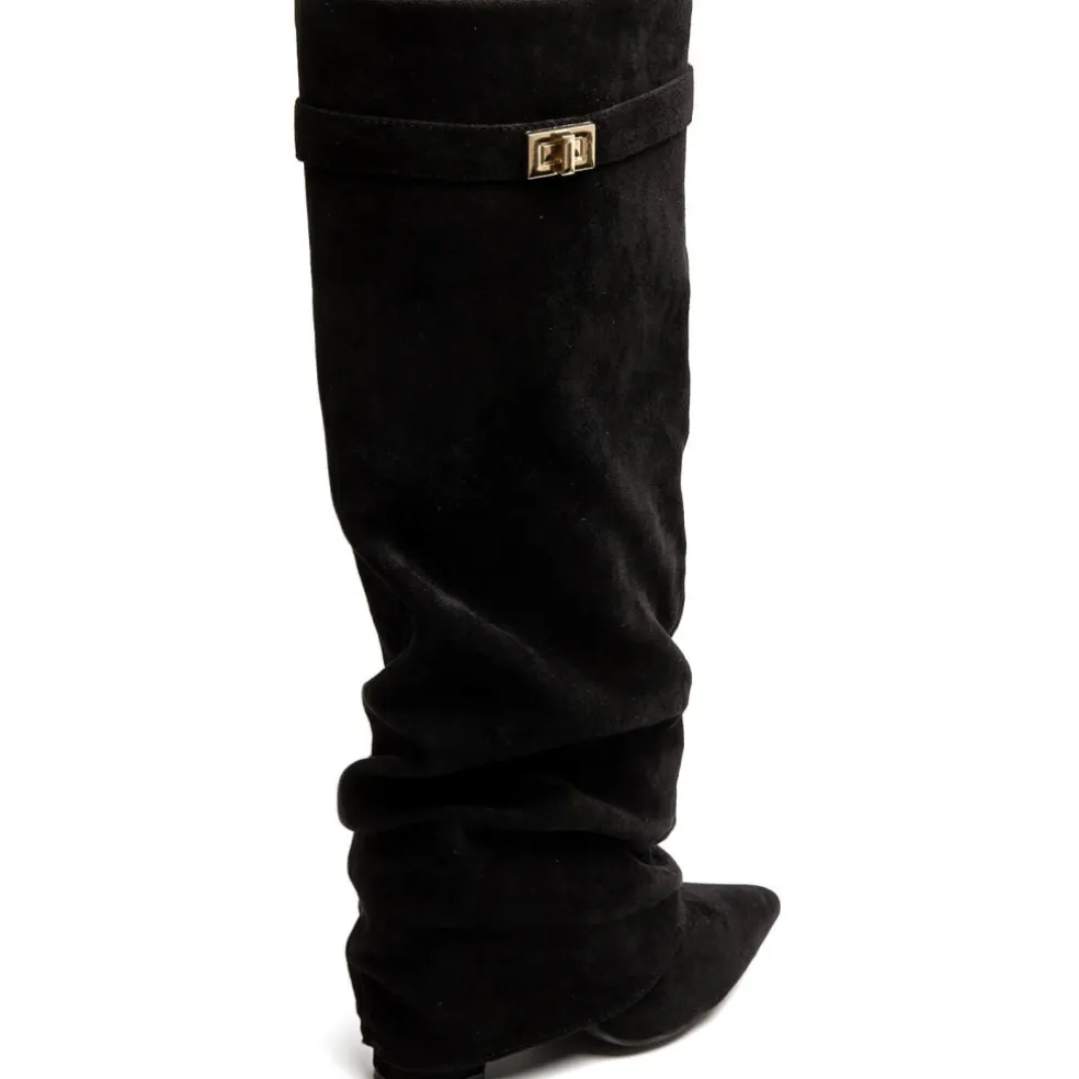 Cool højskaftet støvle med spids snude i imiteret ruskind, perfekt til både hverdag og fest.