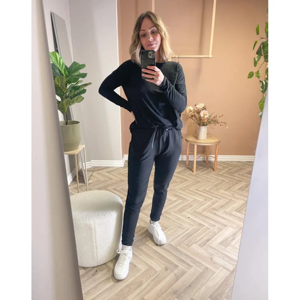 Fin og enkel langærmet top fra Liberté. Den er i en stretchy kvalitet, hvilket gør den super rummelig og behagelig at have på.