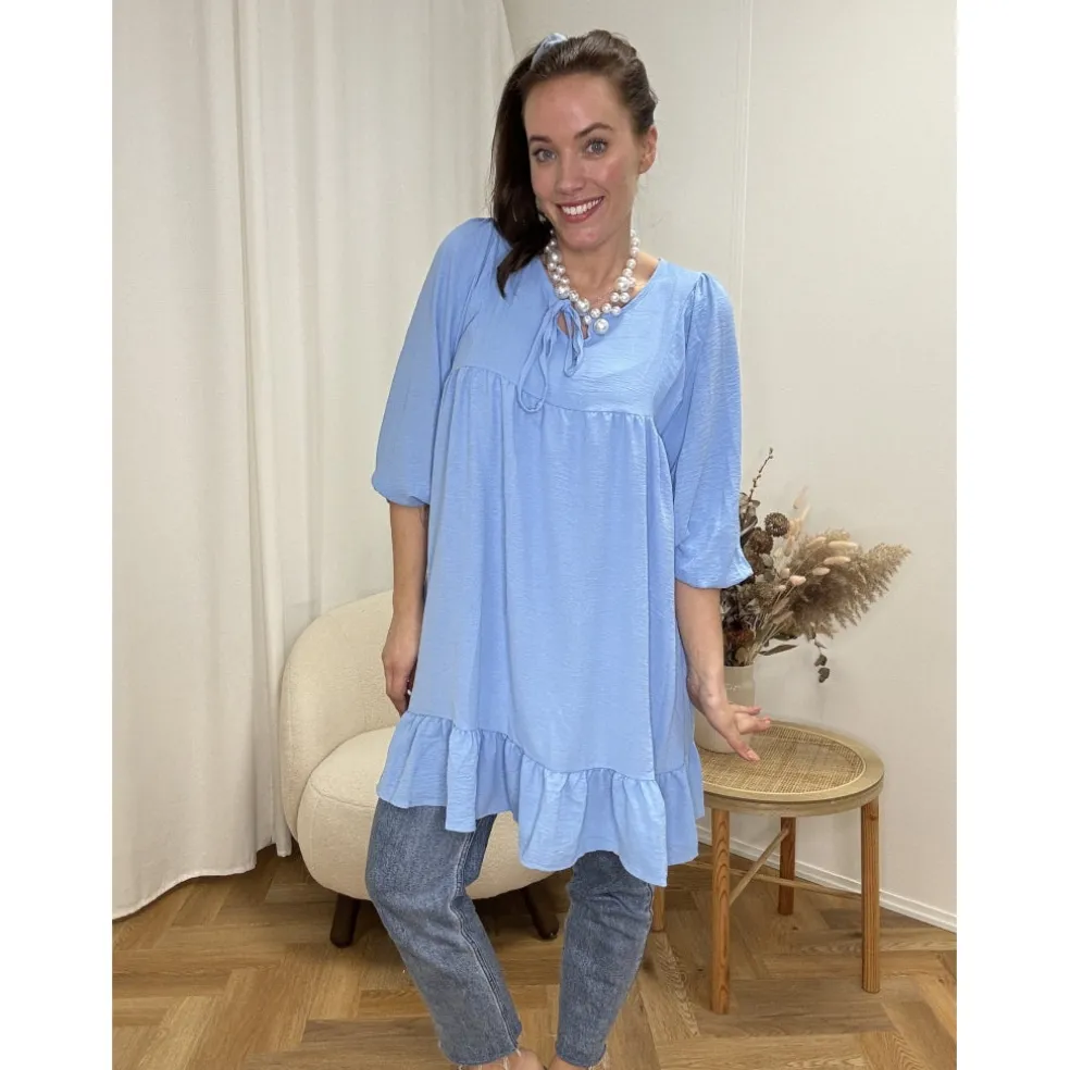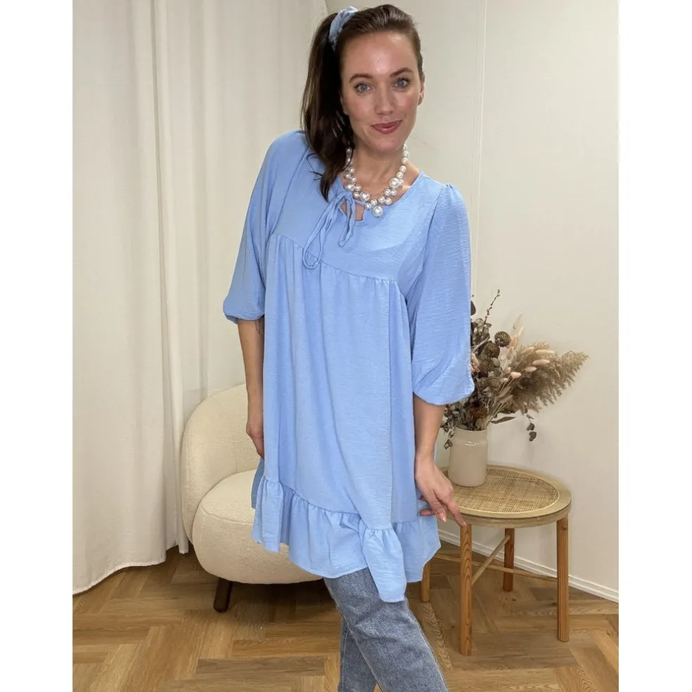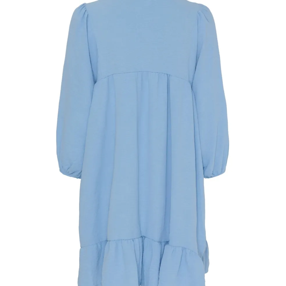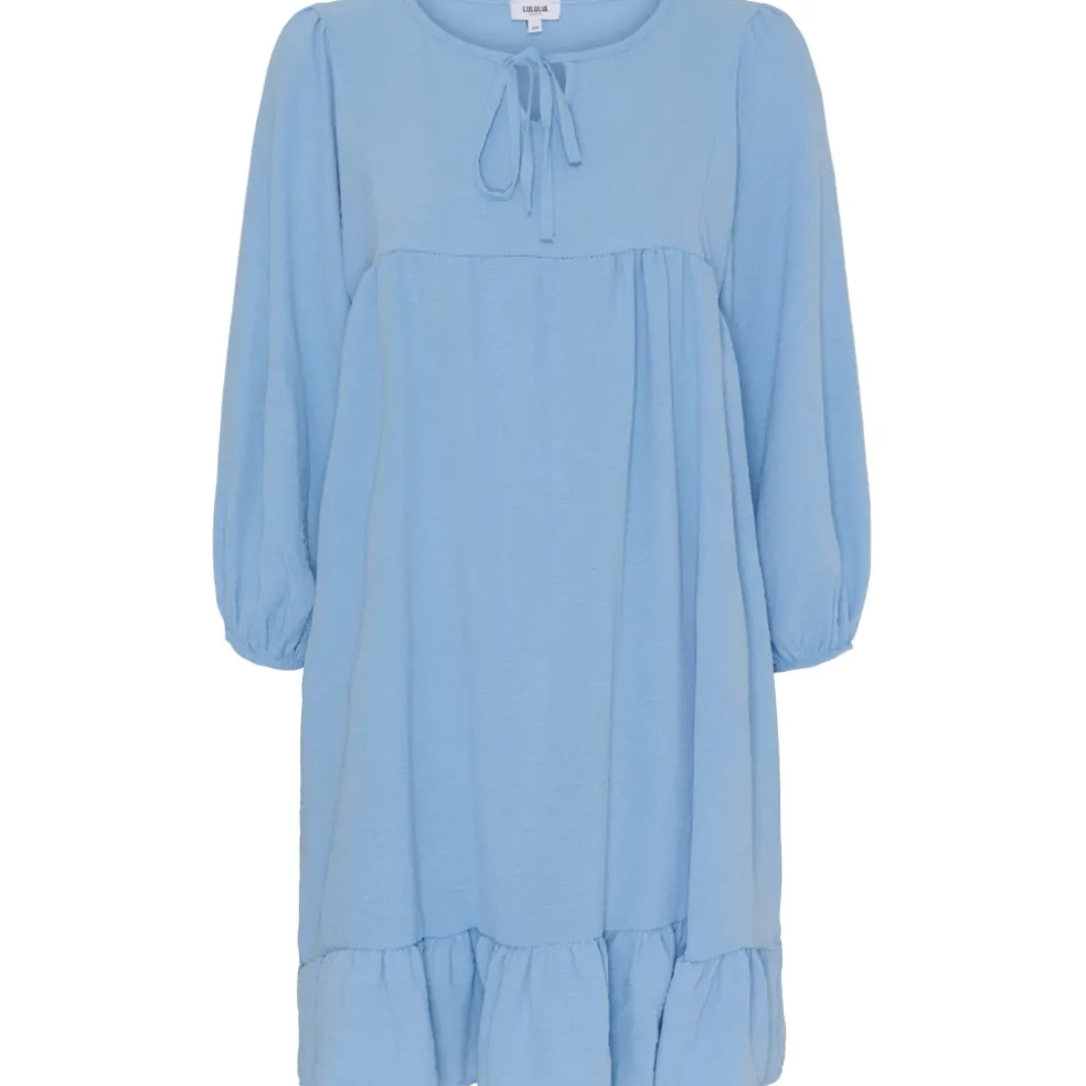 Elegant kjole med et fint bindebånds detalje ved kraven. Kjolen er oplagt at bruge til både hverdag og fest.