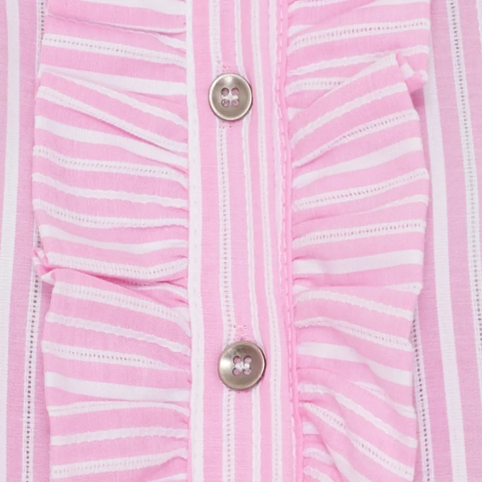 Smuk stribet bluse med fine flæsedetaljer og knapper. Blusen har en lidt høj krave, og den kan både styles til jeans & sneakers og nederdele & ballerinaer alt efter anledningen.