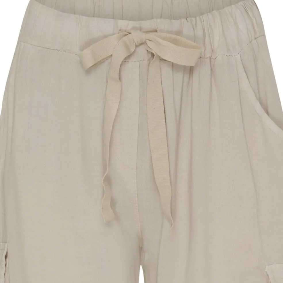Skønne cargobukser i hørblanding med bindebånd i taljen.