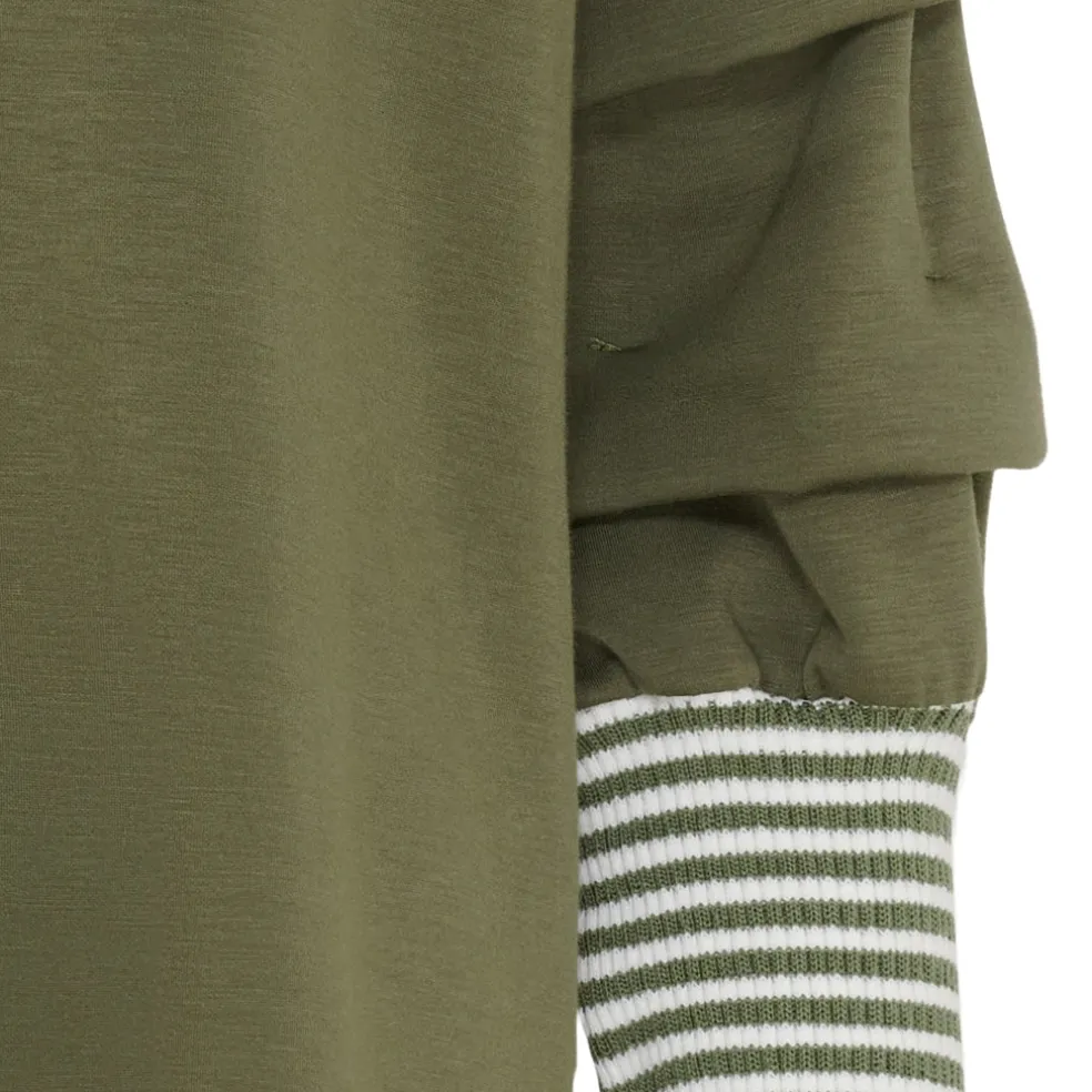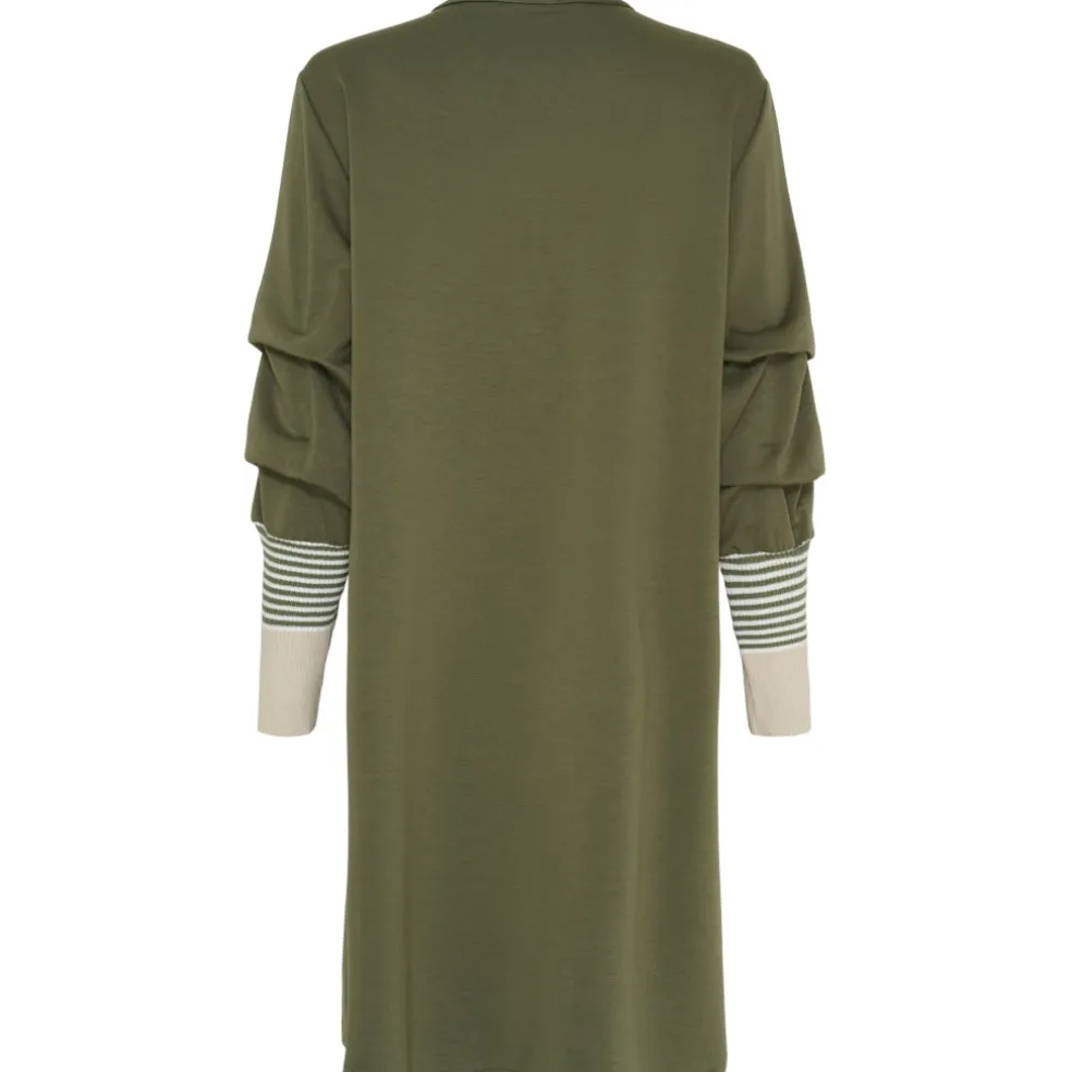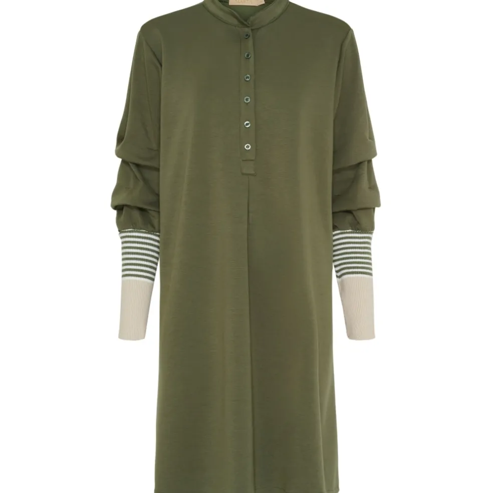 Fin kjole med enkle knapper og lange ærmer med kontrastmanchetter i striber. Kjolen har en høj, feminin krave og kan både bruges til sneakers og støvler. Brug den for sig selv eller tilføj tights eller leggings.