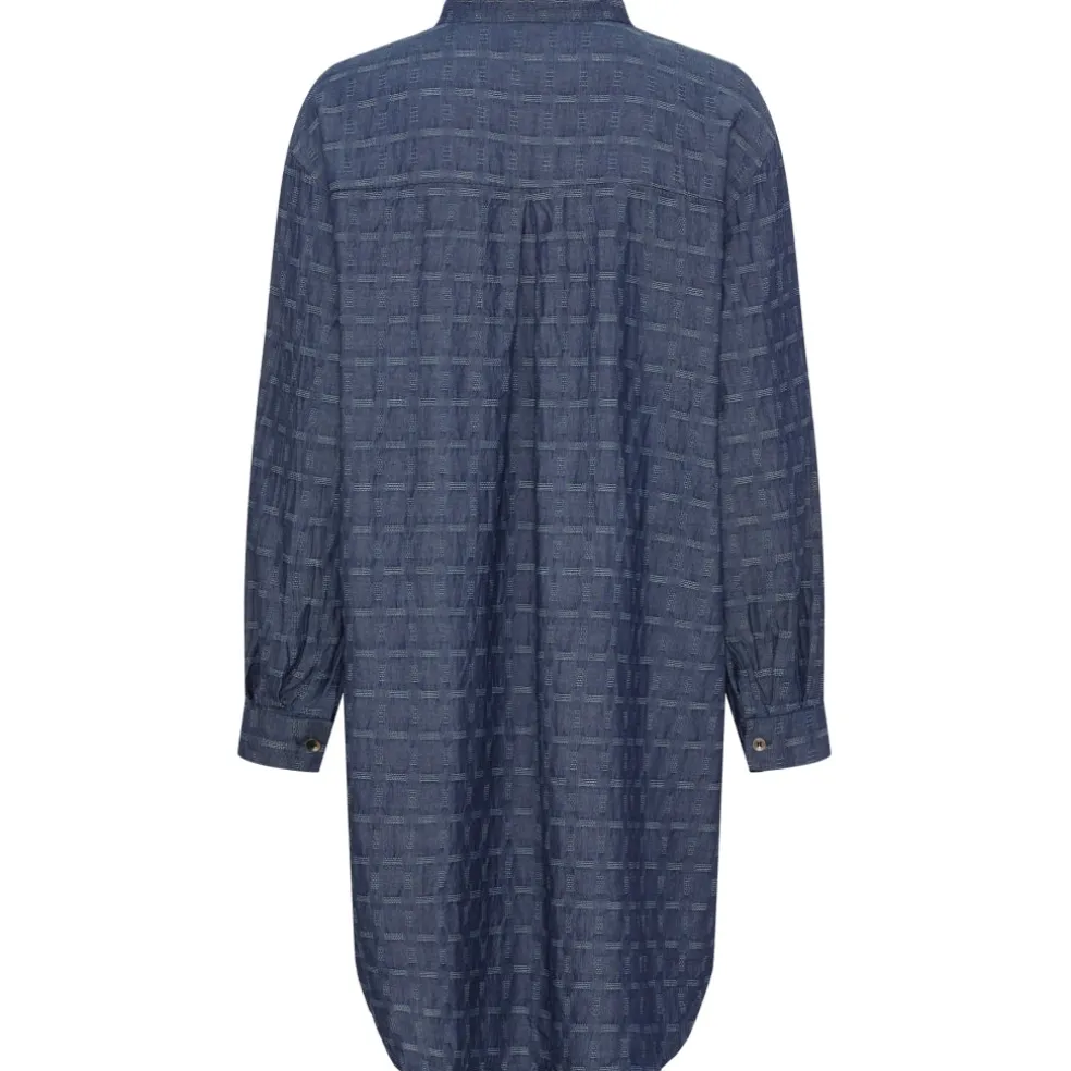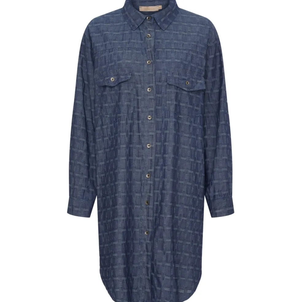 Smukkeste denim kjole fra Marta Du Château med fine detaljer. Kjolen er gennemknappet, har sidelommer og er ideel til både hverdagsbrug og finere brug. Kan styles med matchende bukser under fra samme serie.