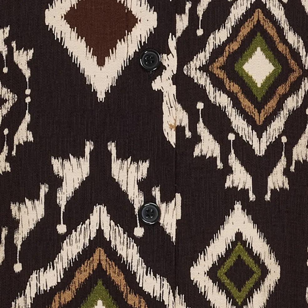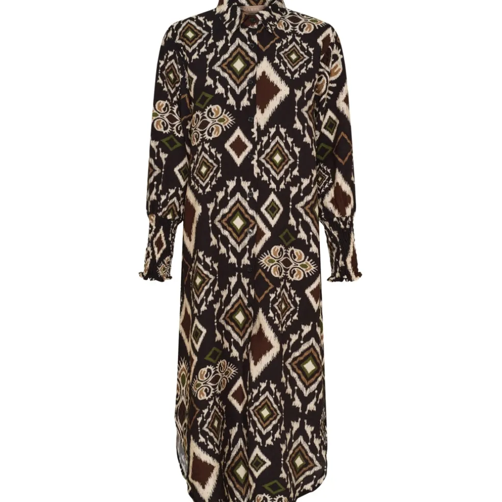 Smuk og elegant printet kjole fra Marta Du Château. Kjolen er gennemknappet, har krave og smock ved ærmer. Kan bruges til både hverdag og finere brug.