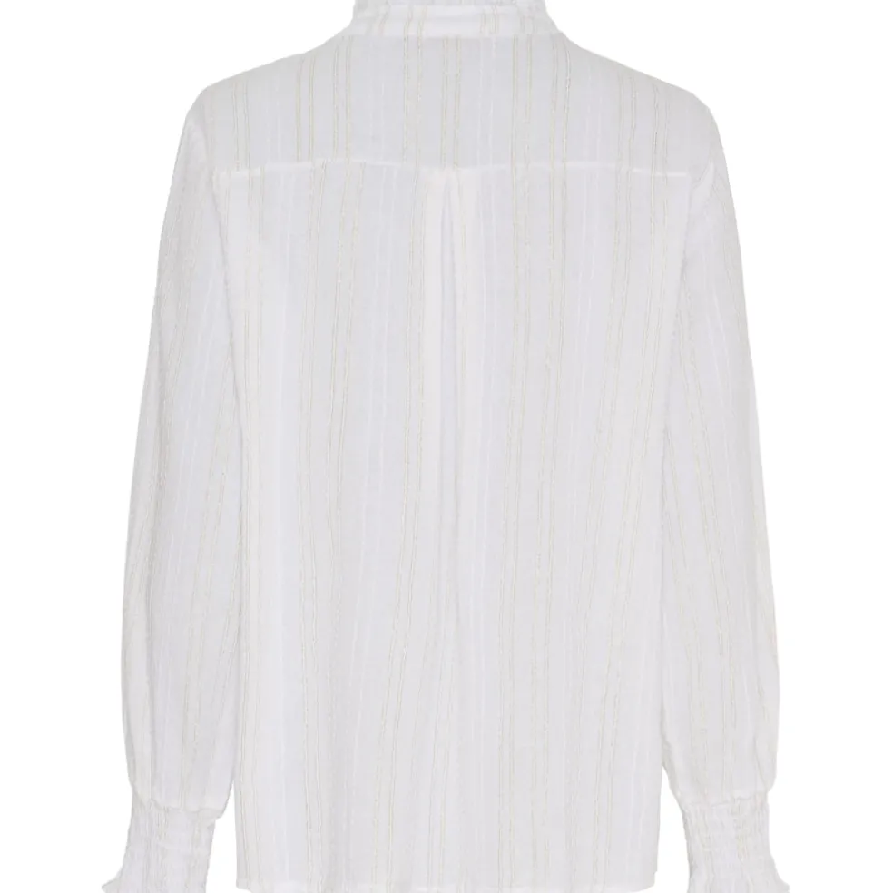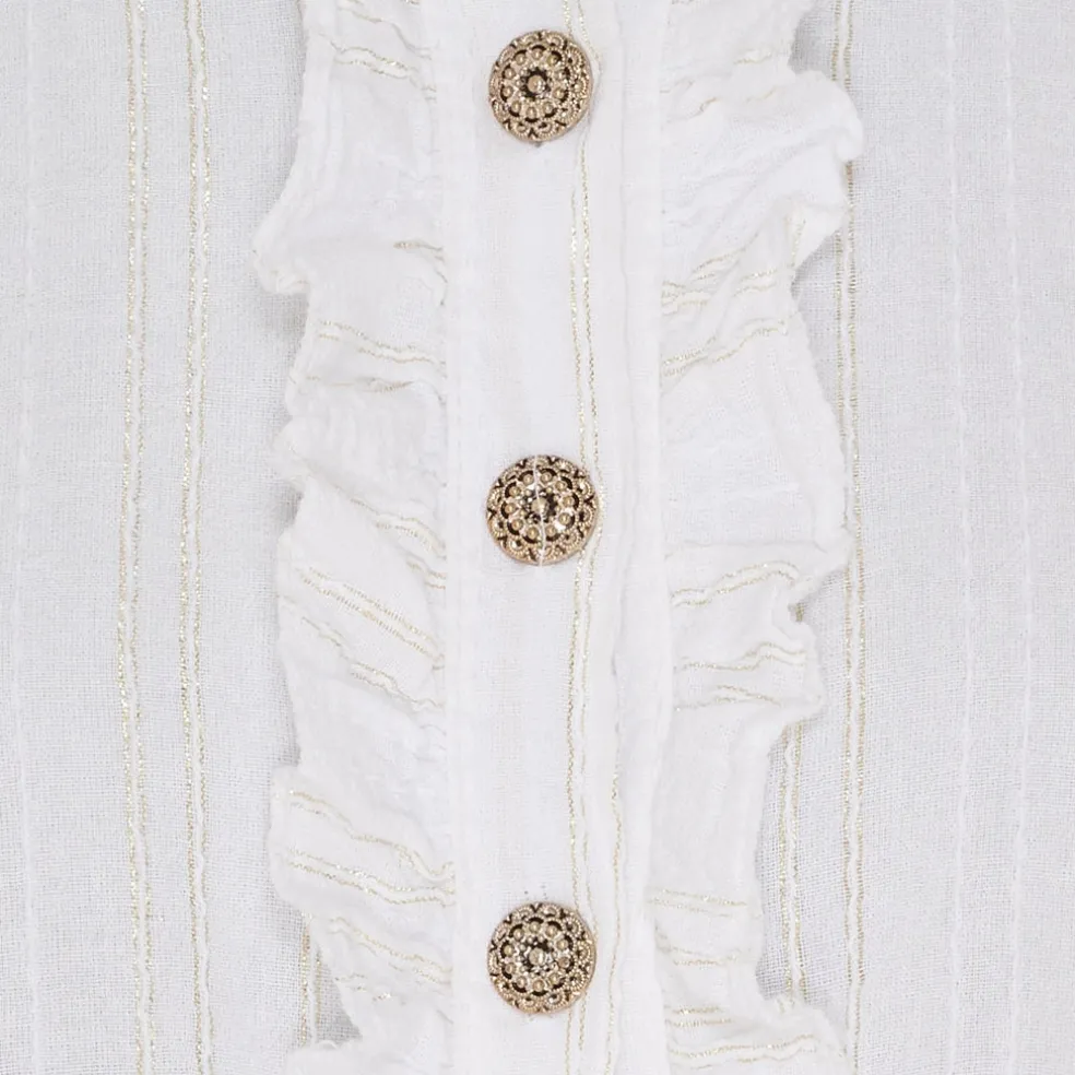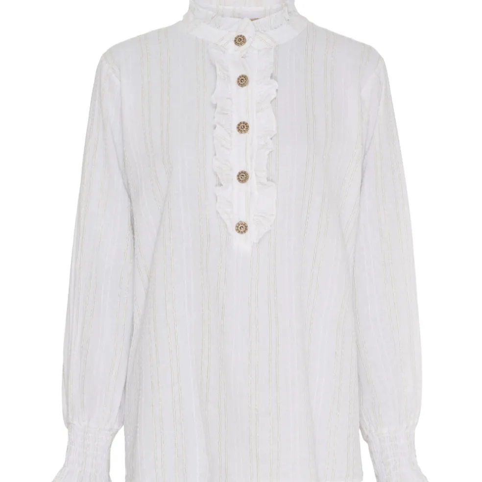 Smuk bluse med flæser, glimmer og elegante knapper. Blusen har en høj, feminin krave som tilfører et ekstra touch til dit outfit.