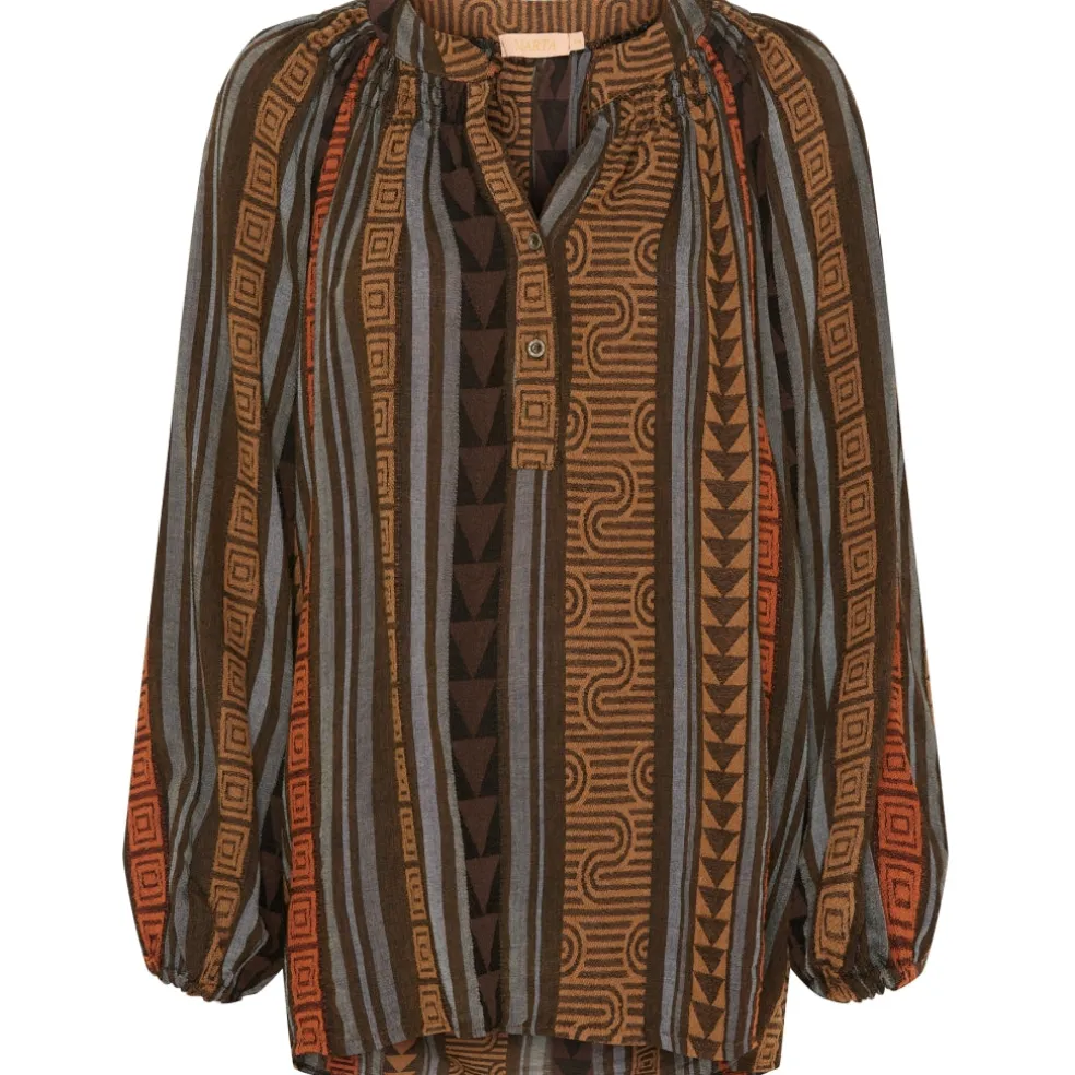 Lækker bluse med knapper ved v-halsen og elastik ved håndledet.