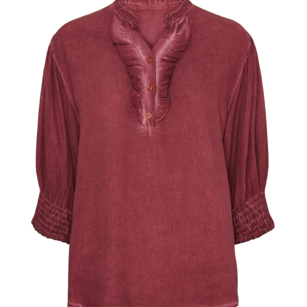 Fin bluse med flæser og smock ved ærmerne. Ideel til hverdag med et par jeans og sneakers til.
