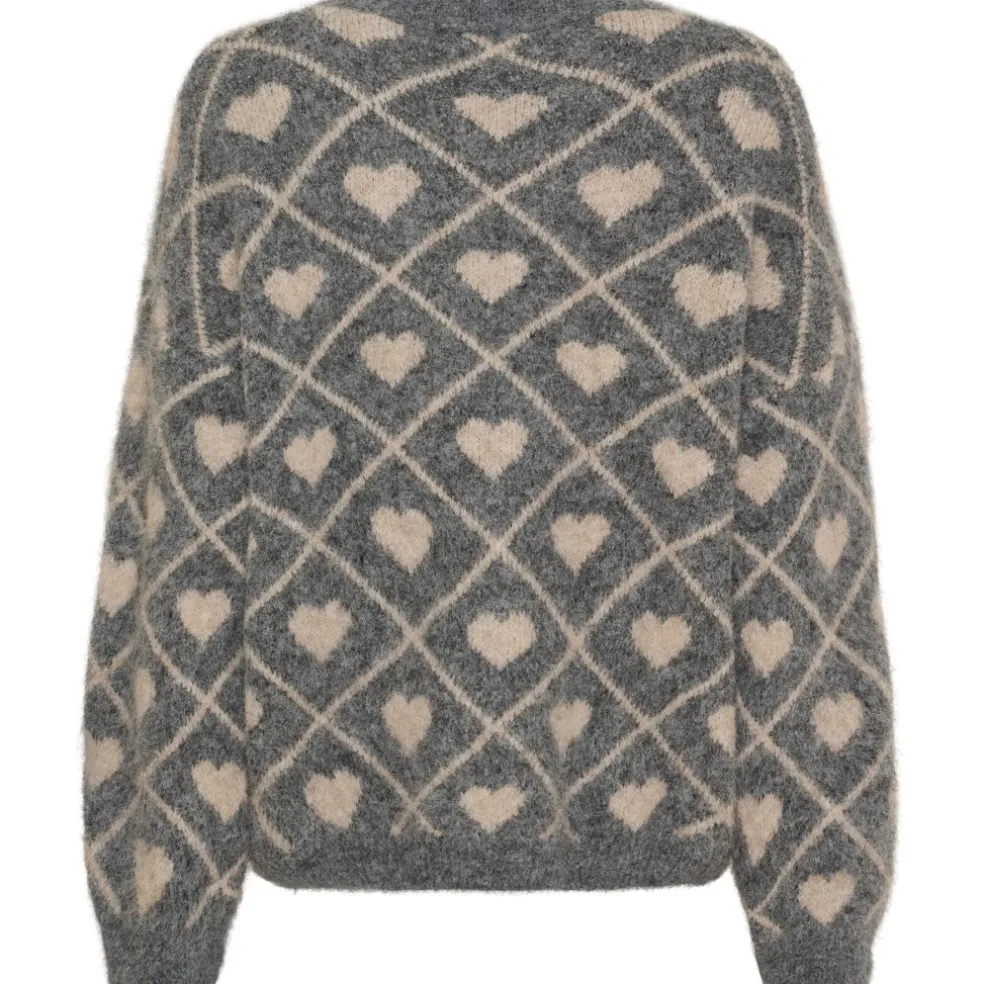 Klassisk, lækker striktrøje fra Marta du Château i et fint hjerte print. Strikken har ribkant ved ærme, hals og nederst på trøjen. Kan styles med alt i garderoden – helt ideel til de kolde efterårsdage.