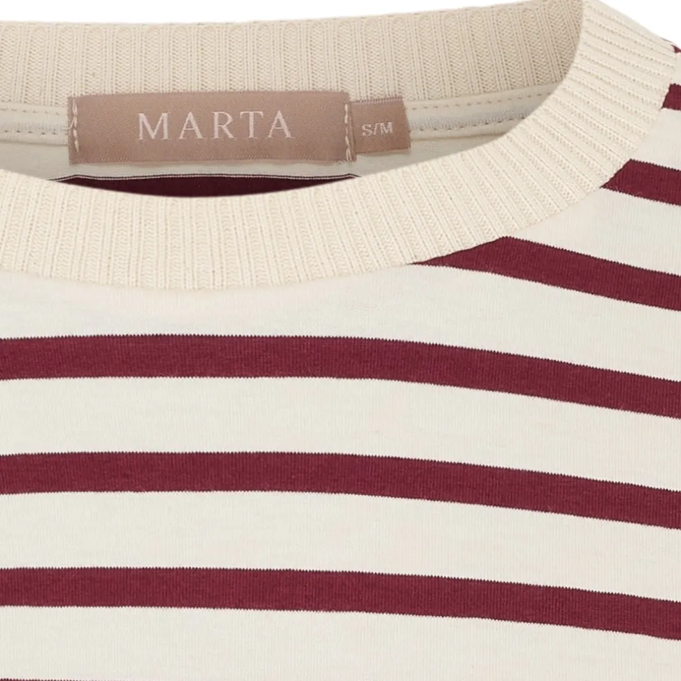 Basic og komfortabel stribet t-shirt fra Marta Du Château. Den har rund hals med ribkant og 3/4 lange ærmer. Ideel til hverdag med et par enten jeans, bukser eller nederdel.
